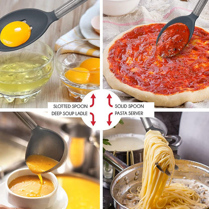 ALL IN ONE FOR ALL COOKING NEEDS: The 14-piece silicone utensil set includes Slotted and Solid Turners, Spatulas, Spoons, Soup Ladle, Pasta Server, Spreader and Spoon Spatula, Basting Brush, Kitchen Tongs, Egg Whisk, and Draining Holder.