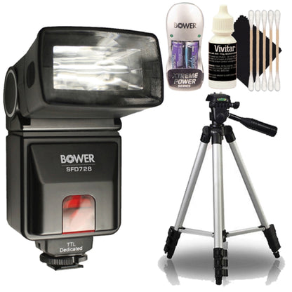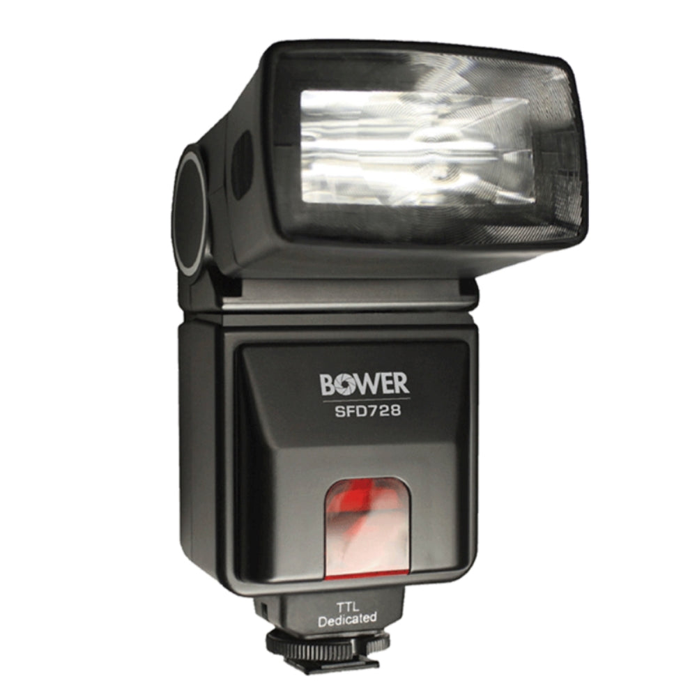 The Bower SFD728 Autofocus TTL Flash is a dedicated shoe-mount flash with i-TTL exposure metering capabilities for Nikon cameras. The flash features a guide number of 92' at ISO 100 and a TTL range of 45.9' for automatic control of the flash output. The four-position zoom head covers a focal length range between 28mm and 85mm and a 0-90° bounce and 330 degrees swivel design enables extensive head positioning capabilities.