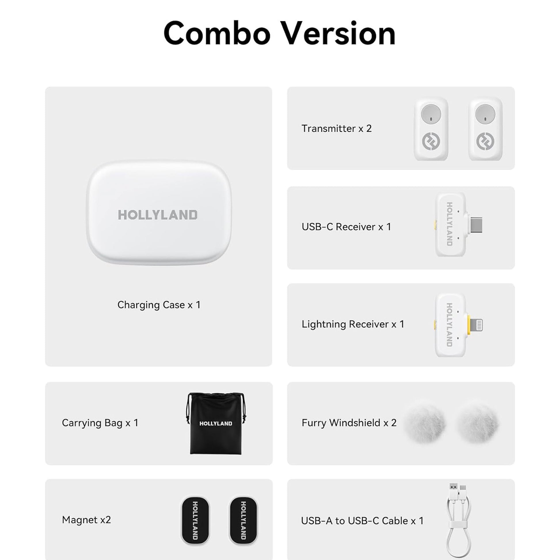 Hollyland LARK A1 Combo 2-Person Wireless Microphone System with USB-C and Lightning Connectors for Mobile Devices (Ivory White, 2.4 GHz)The Hollyland LARK A1 Combo is a dual-channel, digital wireless microphone system engineered for effortless smartphone connectivity and plug-and-play operation ideal for streaming, vlogging, podcasting, and video production with two people speaking at the same time. The system includes two ultracompact, clip-on transmitters with built-in omnidirectional microphones for discreet, high-quality recording, and Lightning and USB-C plug-in receivers for direct use with iOS and Android devices, two furry windscreens for outdoor shoots, and a convenient charging case.
