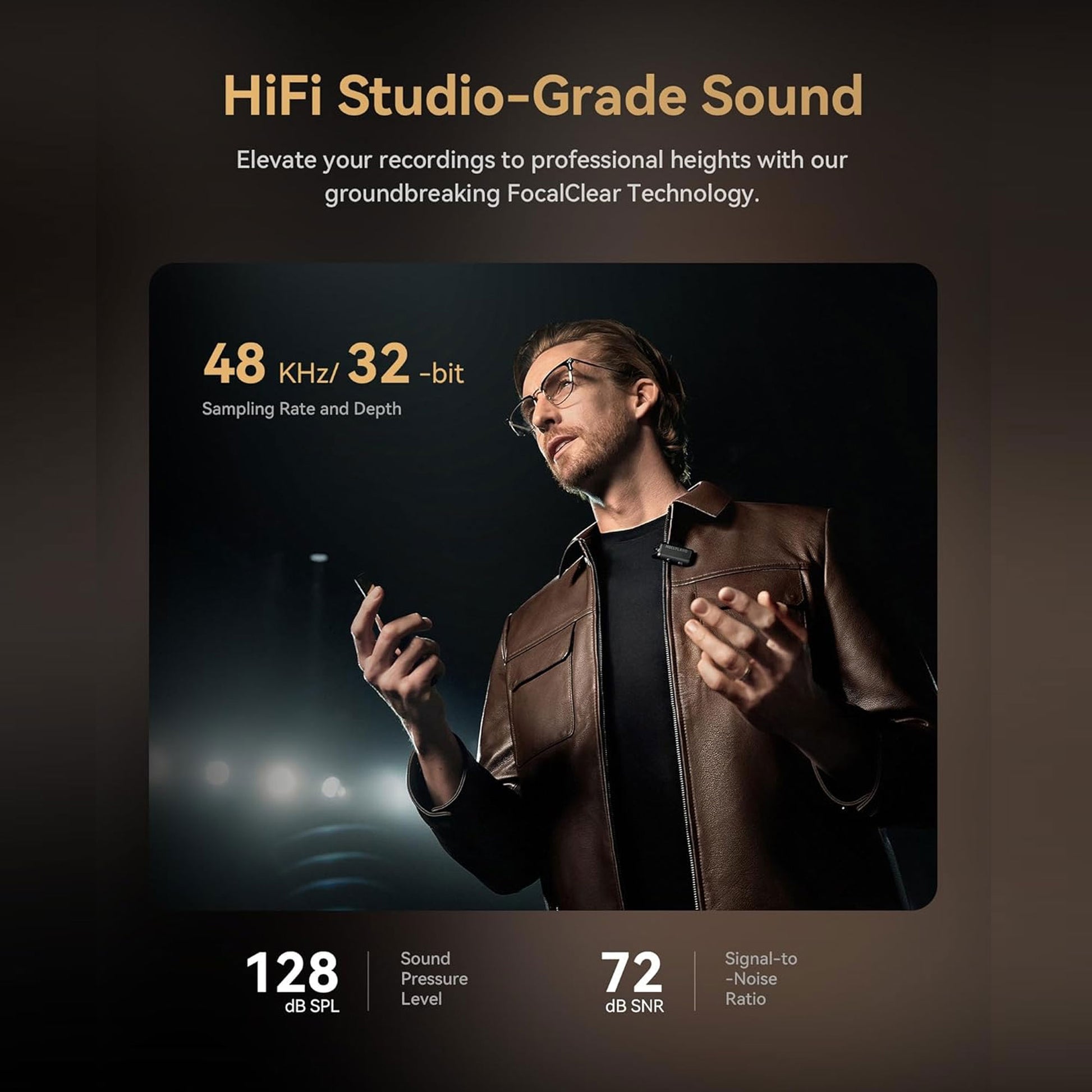 - AI-Powered Studio Clarity Pioneering deep-learning noise cancellation (5–25dB stepless adjustment) paired with 48kHz/32-bit float studio-grade recording ensures your wireless microphone captures vocals in pristine detail while eliminating background noise. Ultra-Low latency, zero clipping, and 128dB SPL deliver broadcast-ready audio for live streaming, podcasts, and pro recordings—ideal for high-volume environments.