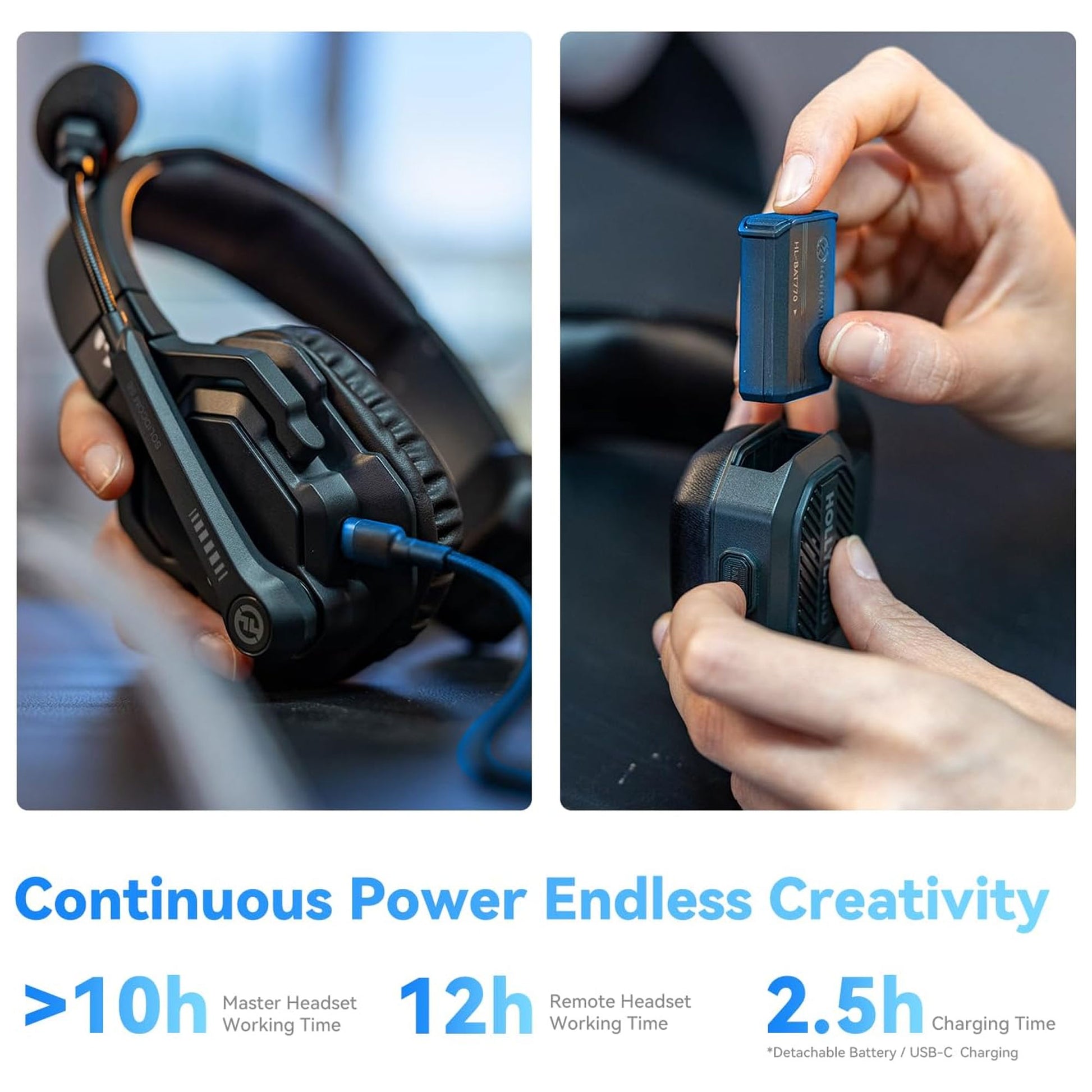 Crafted with lighter and more durable materials, the headset is superlightweight, weighing approximately the same as an apple. Say goodbye to discomfort during extended wear. The replaceable over-ear earpad comes in handy especially in summer, keeping your ear sanitary at all times. The Solidcom SE Global headset features a detachable rechargeable battery, ensuring the system keeps running with minimal downtime; it will run for up to 12 hours on a single charge. The battery can be recharged in a Hollyland SE Global charging station (not included) or via the included USB cable.