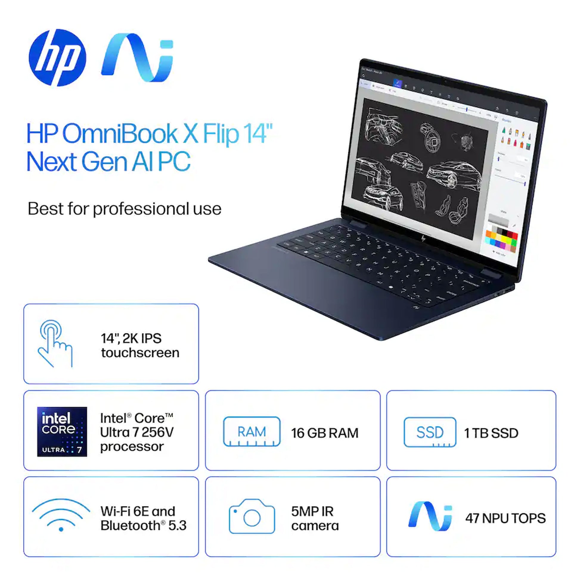 HP OmniBook X Flip 2-in-1 14" 2K Touch-Screen Laptop - Intel Core Ultra 7 256V 2024 - 16GB Memory, 1TB SSD (Atmospheric Blue) Take your creativity to go with the thin and light HP OmniBook X Flip 14 Next Gen AI PC. Multiple modes enable you to work and play from any angle, while a high-resolution edge-to-edge 2K multitouch-enabled display makes every view crisp and clear. An AI-powered Intel Core Ultra processor and an all-day, fast-charging battery ensures that you have the speed, performance, and endurance to create wherever you are. Copilot+ PCs bring exclusive on-device AI experiences designed to accelerate productivity and creativity.
