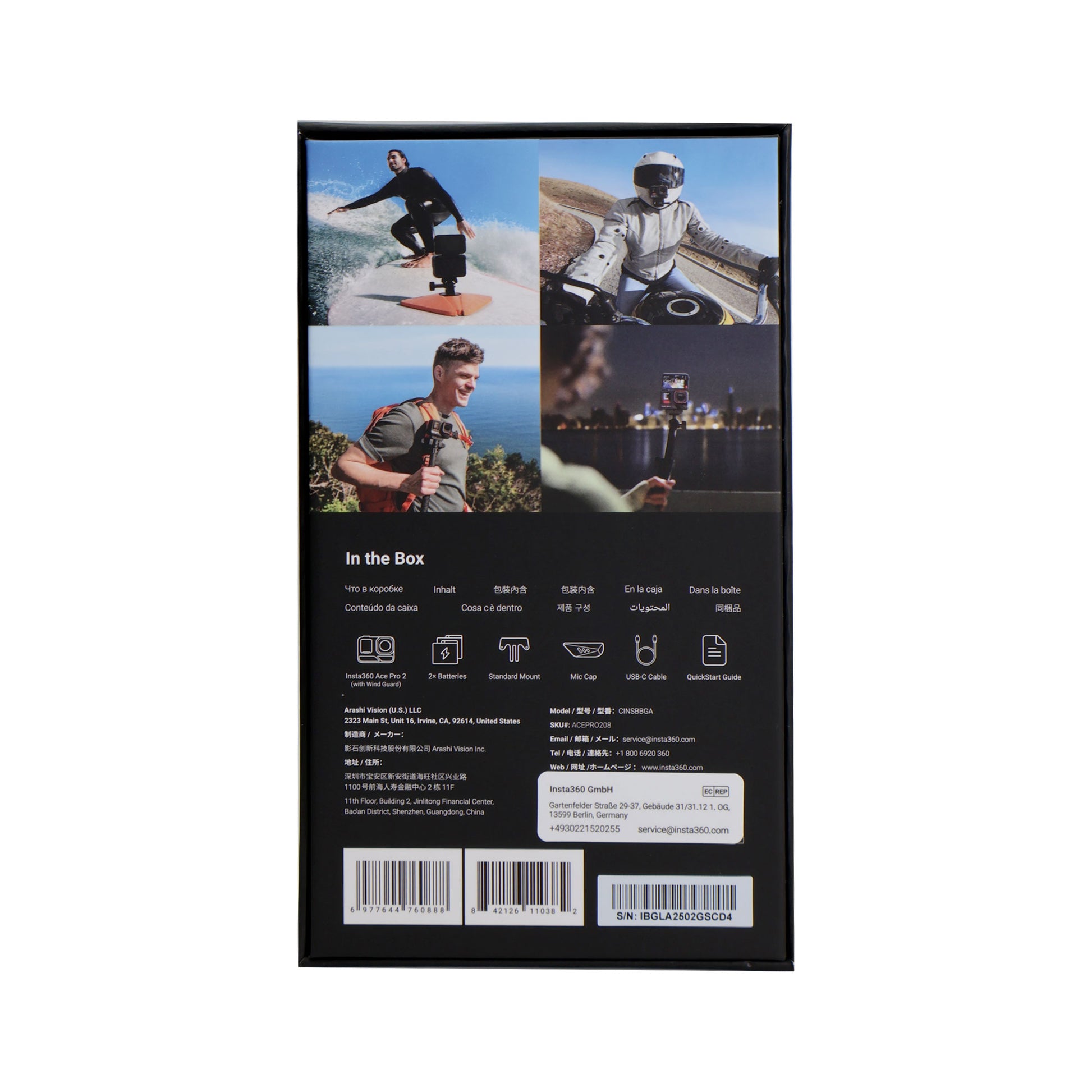 - In the box - 1x Insta360 Ace Pro 2, 1x Wind Guard (pre-installed by default), 2x Batteries, 1x Standard Mount, 1x Mic Cap and 1x USB-C Cable, 1 x Utility Frame, 1 x Wrist Strap Cap, 1 x Cold Shoe Shutter Button ,1 x Decorative Cold Shoe, 1 x Grip, 1x128GB Card, 1 x EVO Gimbals Lens Cloth