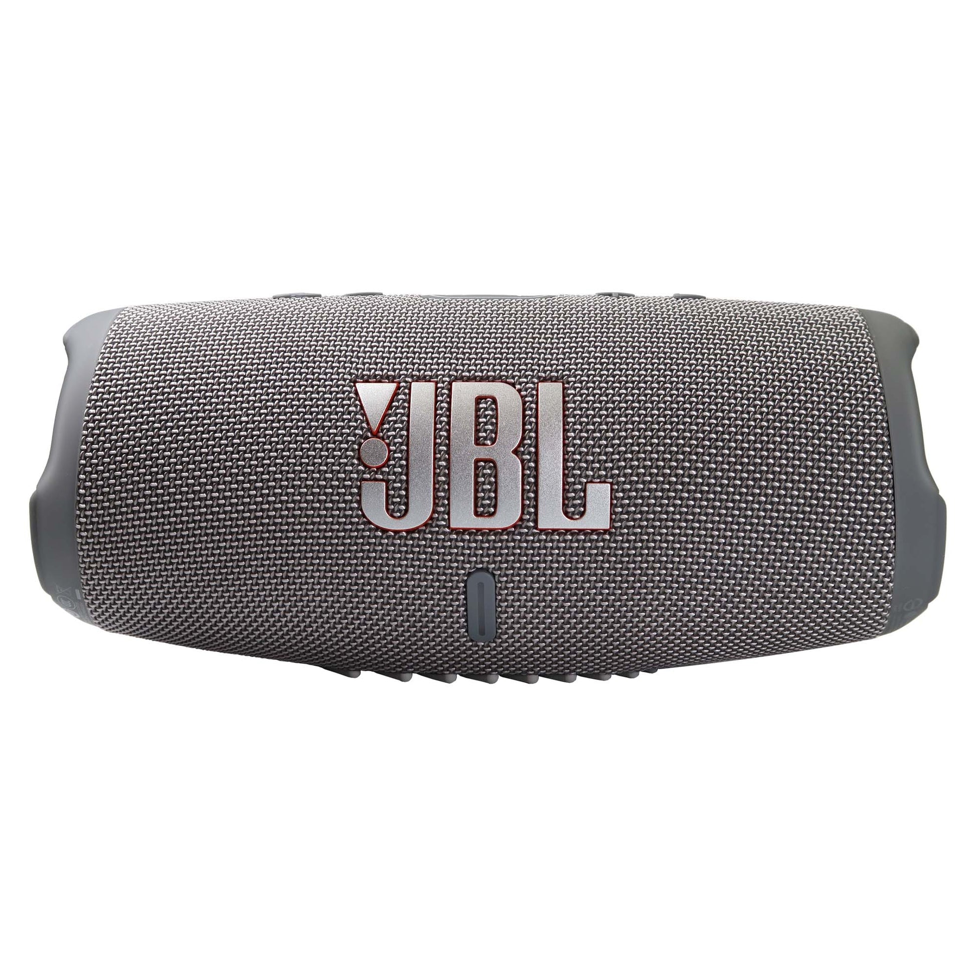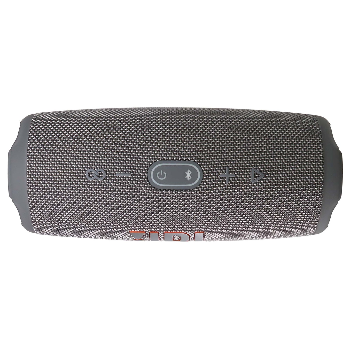 Bring the party nearly anywhere you go with the gray JBL Charge 5 Portable Bluetooth Speaker. With a built-in rechargeable battery that lasts up to 20 hours and an IP67 waterproof and dustproof rating, you can bring the speaker to the beach, park, pool, or wherever you like, and stream music, podcasts, and more wirelessly via Bluetooth. It outputs up to 40W of total RMS power, and dual passive radiators help boost the bass.