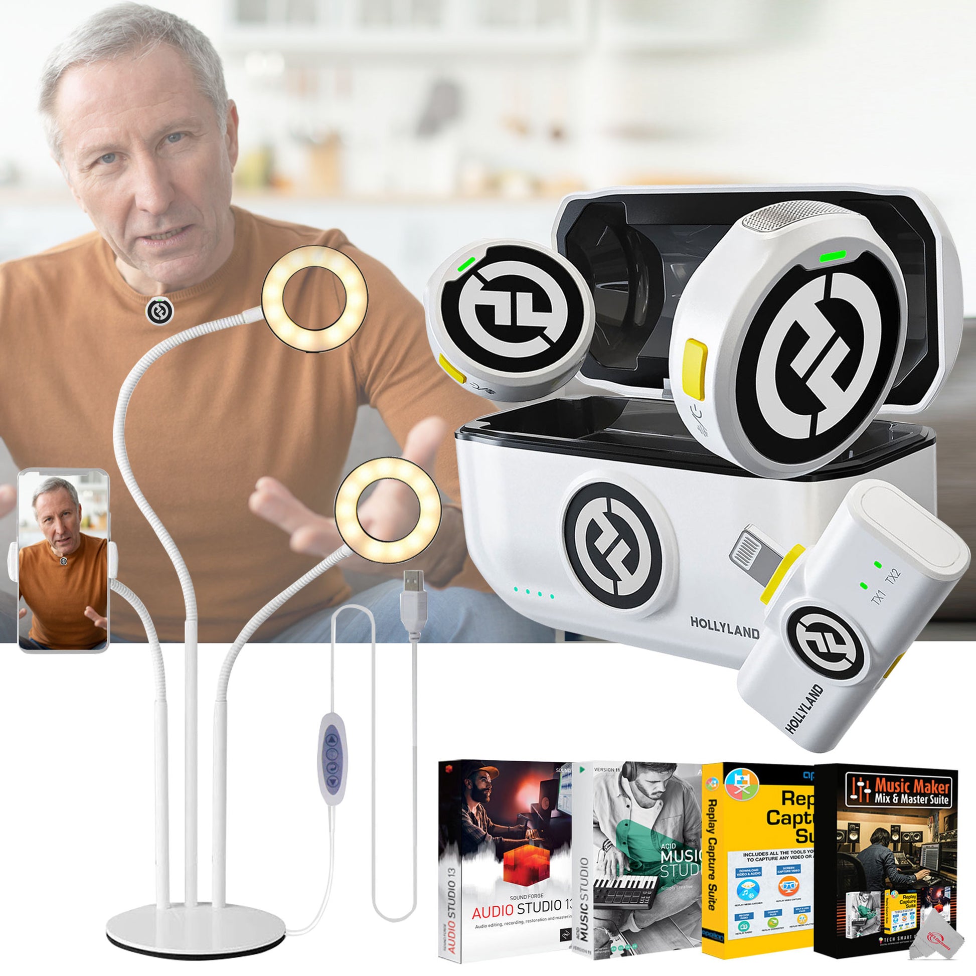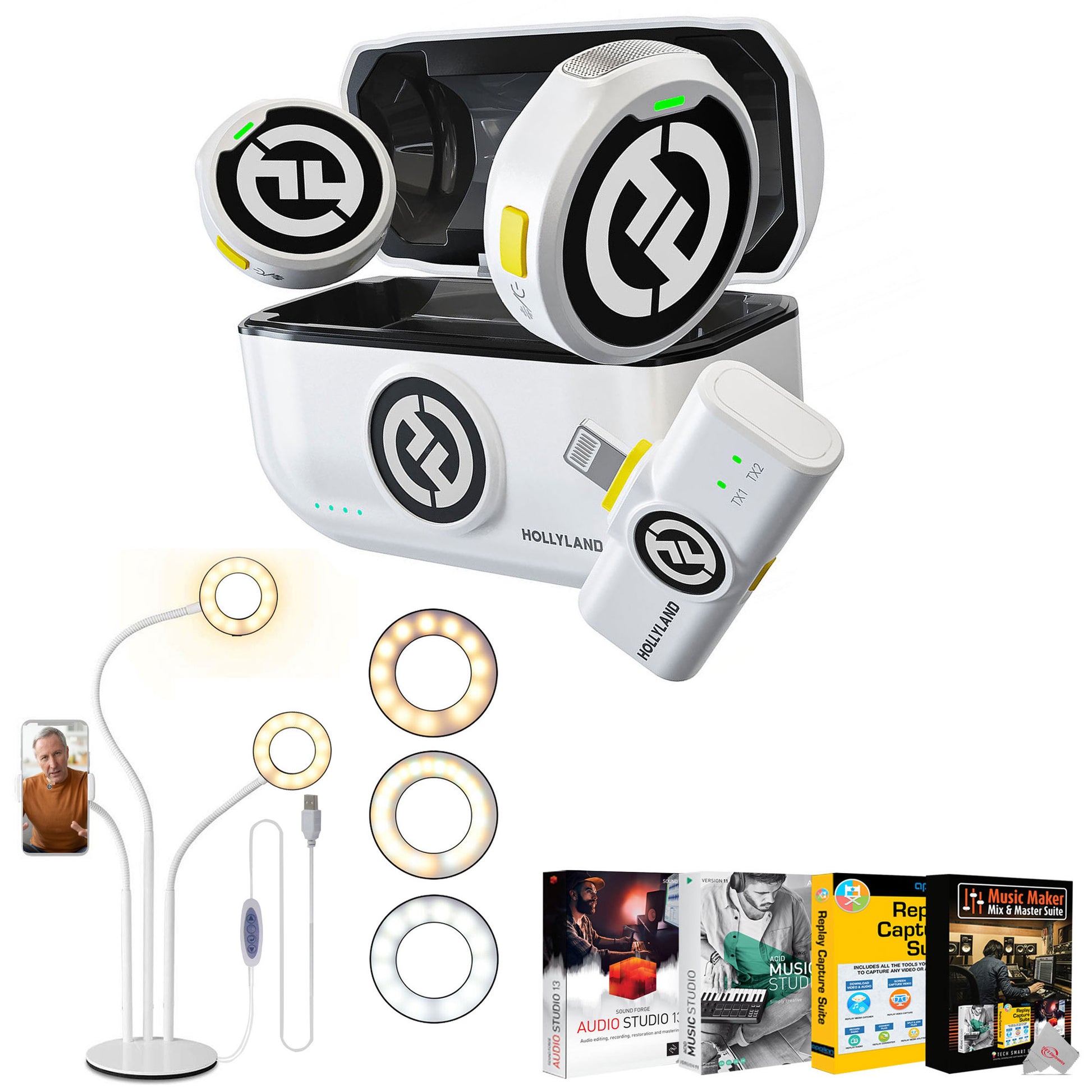 HOLLYLAND LARK M2 DUO 2-PERSON WIRELESS MICROPHONE SYSTEM WITH LIGHTNING CONNECTOR (2.4 GHZ, IVORY WHITE) + VIVITAR 3 IN 1 DESKTOP STAND WITH 2 RING LIGHTS & PHONE CRADLE PC102 + MUSIC MAKER MIX AND MASTER SUITE SOFTWARE
