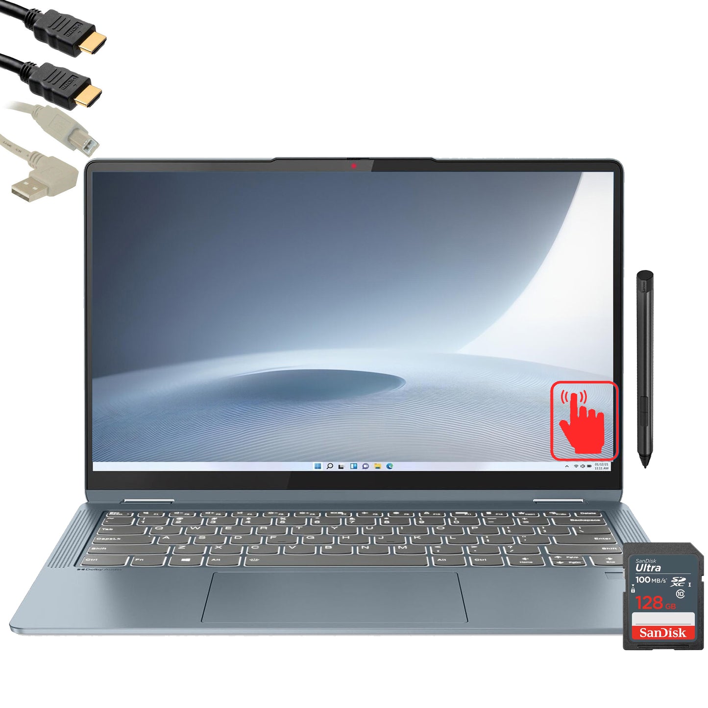 LENOVO FLEX 7 14" TOUCHSCREEN 16GB CONVERTIBLE 2 IN 1 NOTEBOOK - INTEL CORE I7 13TH GEN I7-1355U #82Y20001US (STONE BLUE) + SANDISK ULTRA 128 GB SDXC UHS I MEMORY CARD + 10FT ANGLE USB 2.0 TYPE A MALE TO B MALE CABLE + 6FT HDMI CABLE