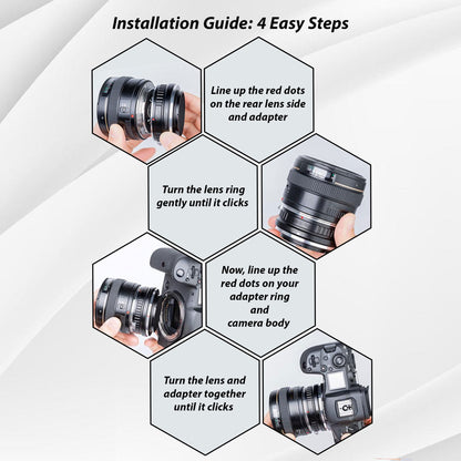 When using it for the first time, simply enable the “release shutter without lens” setting in your camera menu for optimal recognition. Please double-check your camera and lens compatibility before purchasing to avoid any inconvenience. Our support team is always available to help with any questions you may have about adapters.