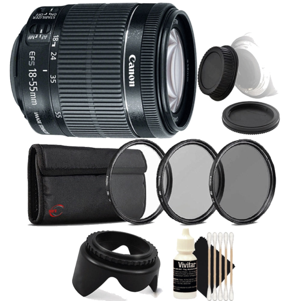 The EF-S 18-55mm f/3.5-5.6 IS STM Lens from Canon is a standard zoom compatible with Canon APS-C format cameras. It features a focal length range of 18-55mm which is equivalent to 29-88mm in the 35mm format. Optical Image Stabilization provides the equivalent of up to four stops of shake correction for clear imaging, even in low light.