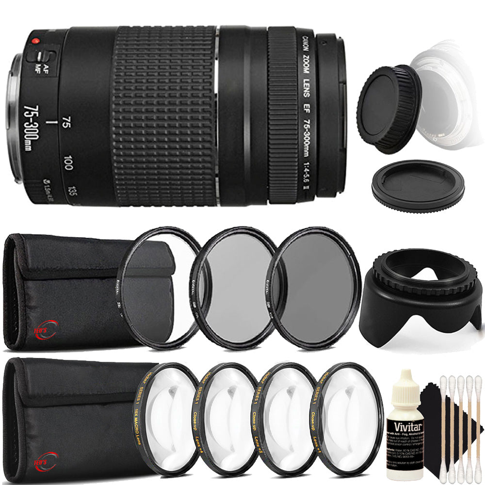 The EF 75-300mm f/4-5.6 III Lens from Canon is a telephoto zoom lens ideal for day-to-day use because it is particularly light and compact, especially given its long focal reach. Able to magnify distant subjects, it also compresses the space between subjects within the frame and with a shallow depth of field at its longer lengths, it offers attractive out of focus bokeh. Its minimum focus distance is 4.9', even at the telephoto end of its zoom.