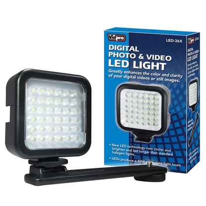 The LED-36X from Vidpro is a highly compact on-camera LED light featuring 5600K daylight color temperature and 40W equivalent light beam. It can be mounted directly on your camera, or to the side of the camera using the included side-mount bracket. The light operates on three AAA batteries (not included) for up to two hours of total run-time. A diffuser is built in that will soften and even out the light output and eliminate bright spots.
