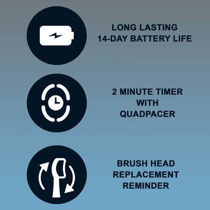 - 2-minute timer with QuadPacer helps ensure dental professional recommended brushing time and encourages brushing in each quadrant of the mouth