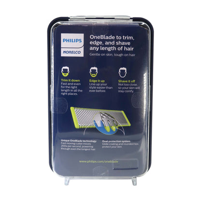 The Philips Norelco OneBlade is a revolutionary an electric grooming tool with technology designed for men who wear facial styles, beards, or stubble. OneBlade trims, edges, and shaves any length of hair. The unique OneBlade shaving technology integrates a fast moving cutter (200x per second) with a dual protection system to give you an efficient comfortable shave on longer hairs. OneBlade does not shave too close, so your skin stays comfortable. The replaceable OneBlades last up to 4 months (for best shaving experience. Based on 2 full shaves per week. Actual results may vary.) OneBlade comes with a 45 day risk-free trial and a full 2-year warranty. Includes 1 OneBlade, 1 Handle, 3 Trimming combs, 1 Power charger. Subscribe & Save on Philips Norelco OneBlade replacement blades and save up to 15%