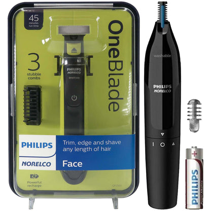 PHILIPS NORELCO ONEBLADE, HYBRID ELECTRIC TRIMMER AND SHAVER, QP2520/70 + PHILIPS NORELCO ULYIMATE COMFORT NOSE TRIMMER1000 BATTERY POWERED NT1605/60 FOR NOSE, EAR, AND EYEBROWS