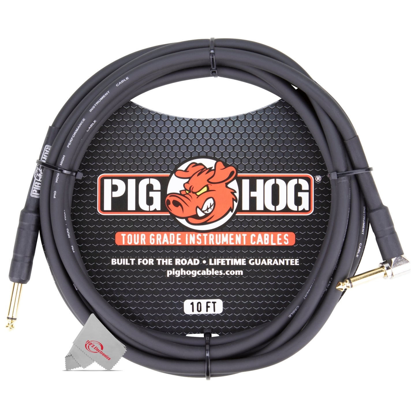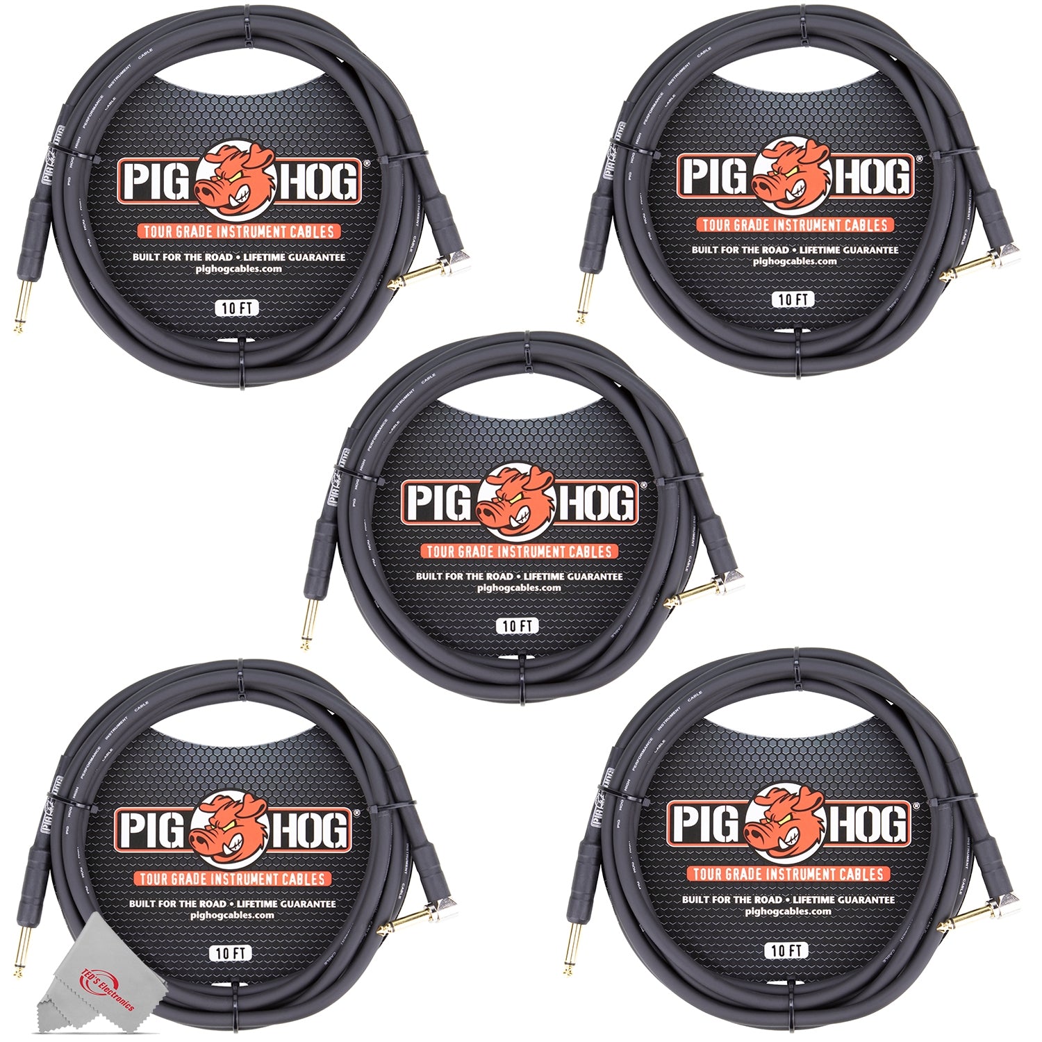 This Kit from Teds Electronics Includes: Pig Hog Tour Grade 10ft Instrument Cable 1/4 Inch to 1/4 Inch Right Angle to Straight Connectors - PH10R - 5 Units