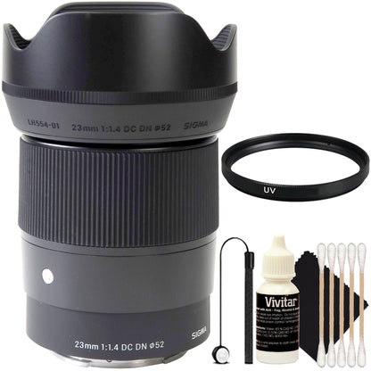 SIGMA 23MM F/1.4 DC DN CONTEMPORARY LENS FOR SONY E-MOUNT (BLACK) + 52MM UV FILTER + LENS CAP HOLDER + VIVITAR THREE PIECE CLEANING KIT FOR CAMERA, LENS, IPHONE OR GLASSES