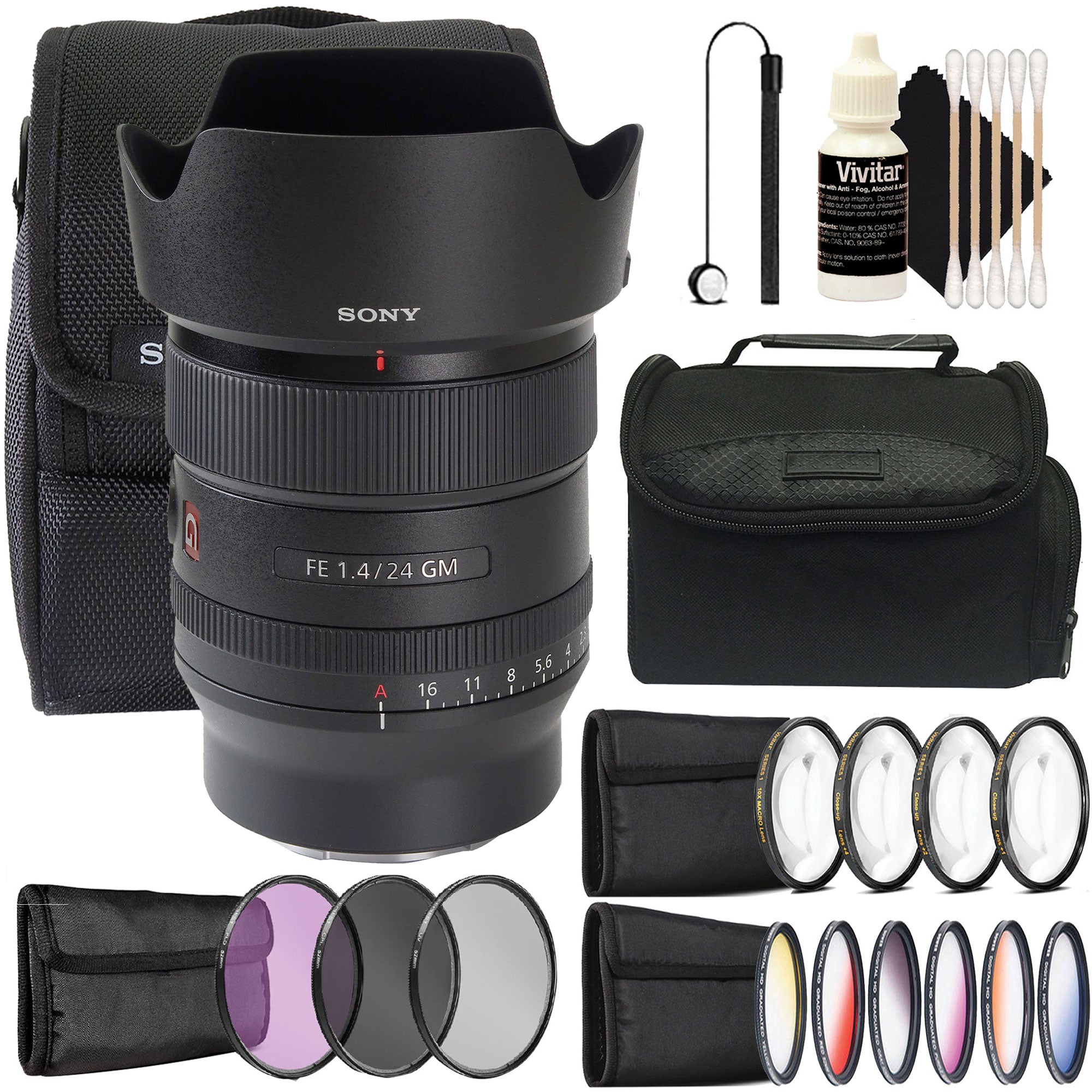 SONY FE 24MM F/1.4 GM LENS + 67MM FILTER KIT + MACRO FILTER KIT + ROTATING GRADUATE FILTER KIT + LENS CAP HOLDER + MEDIUM CAMERA CASE + CLEANING KIT