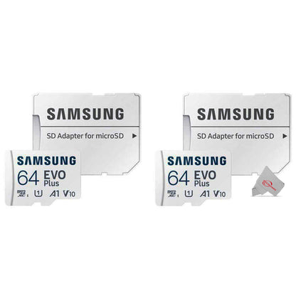 The Kit Includes: 2x Samsung 64GB EVO Plus UHS-I microSDXC Memory Card with SD Adapter