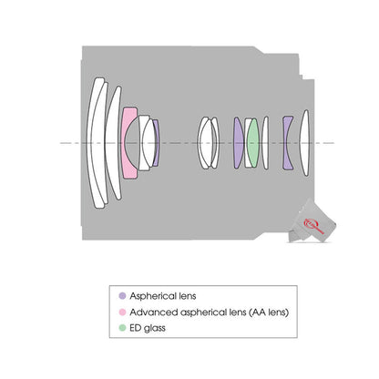 - Four aspherical elements, including one Advanced Aspherical (AA), are incorporated in the lens design to reduce astigmatism, field curvature, coma, and other monochromatic aberrations.