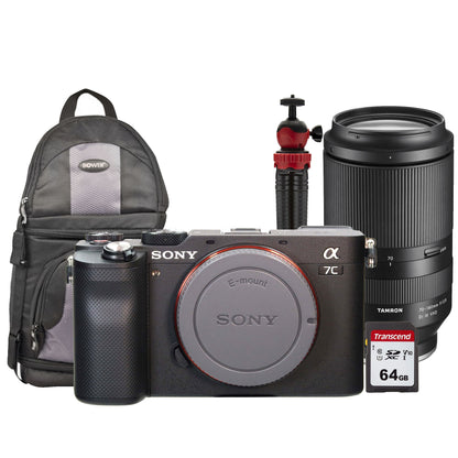 SONY ALPHA A7C MIRRORLESS CAMERA BLACK + TAMRON 70-180MM F/2.8 Di III VXD LENS FOR SONY E + DSLR SLING BACKPACK + TRANSCEND 64GB SDXC MEMORY CARD + VIVTAR 12" ULTRA FLEXIBLE SUPER STEADY TRIPOD