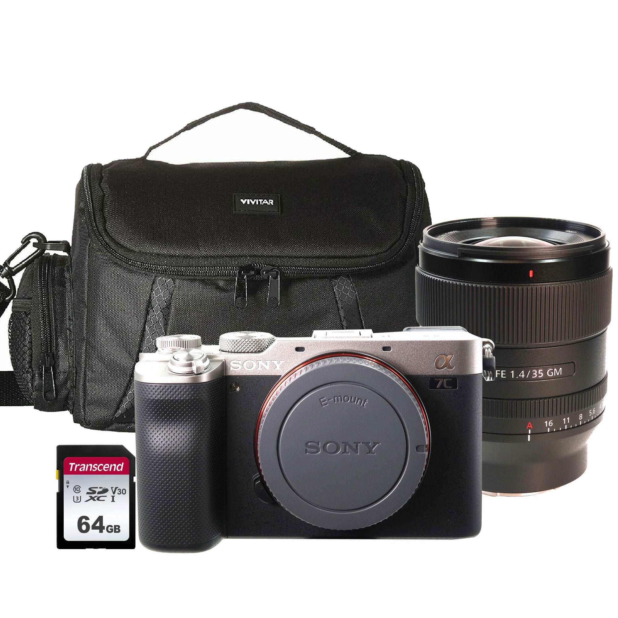 SONY ALPHA A7C MIRRORLESS CAMERA SILVER + SONY FE 35MM f/1.4 GM LENS + FULL SIZE DSLR GADGET BAG + TRANSCEND 64GB SDXC MEMORY CARD