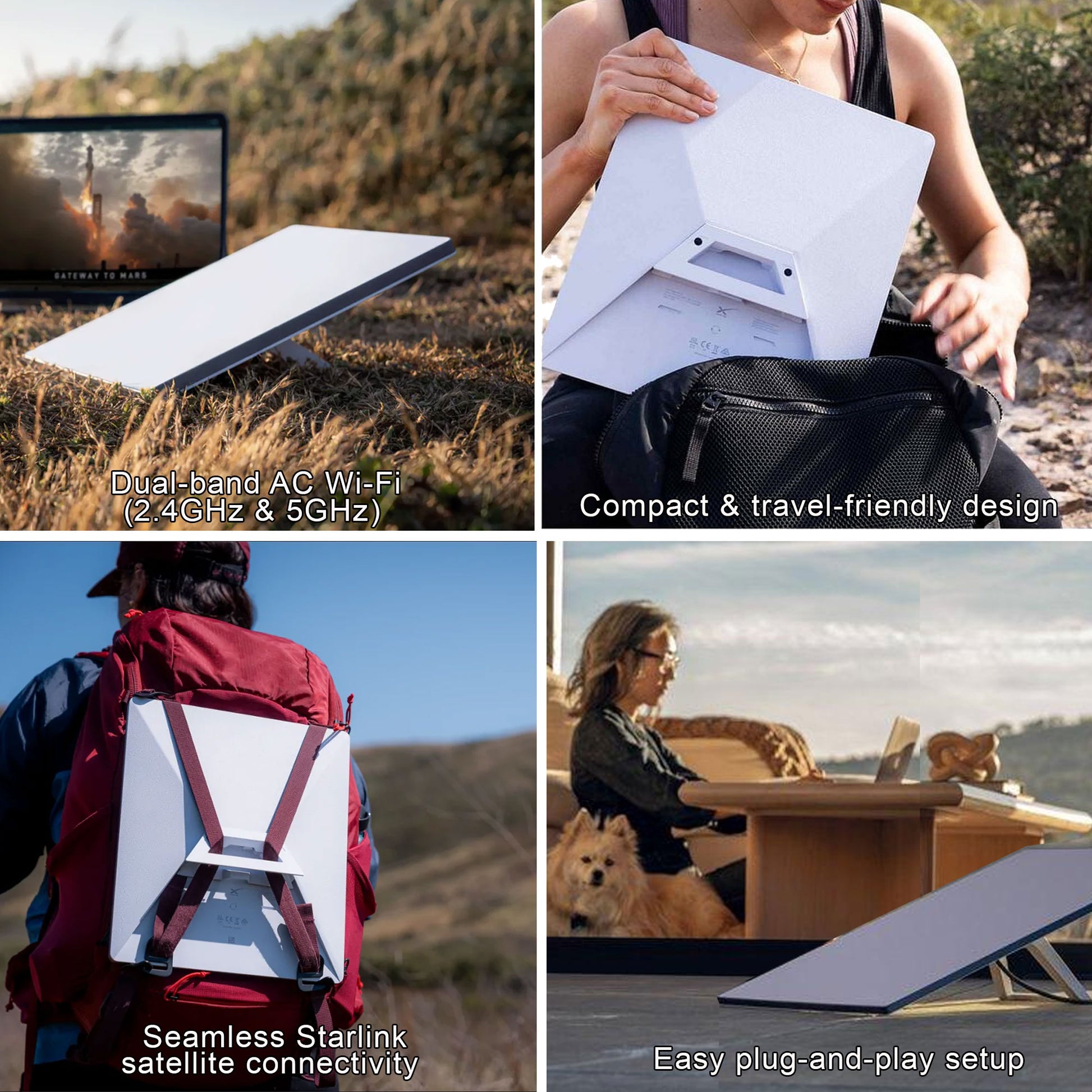 Starlink Mini Kit AC Dual Band Wi‑Fi System delivers fast, low-latency internet with speeds over 100 Mbps, even in rural and remote areas.