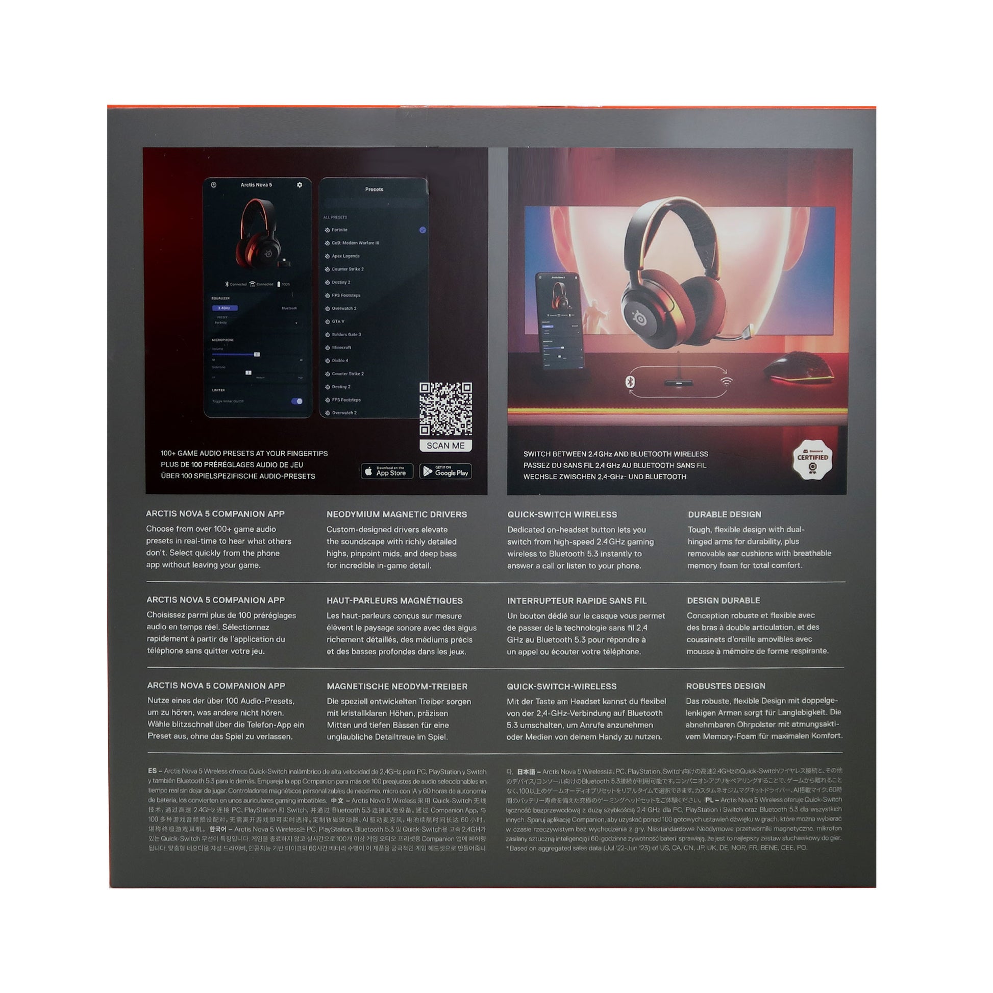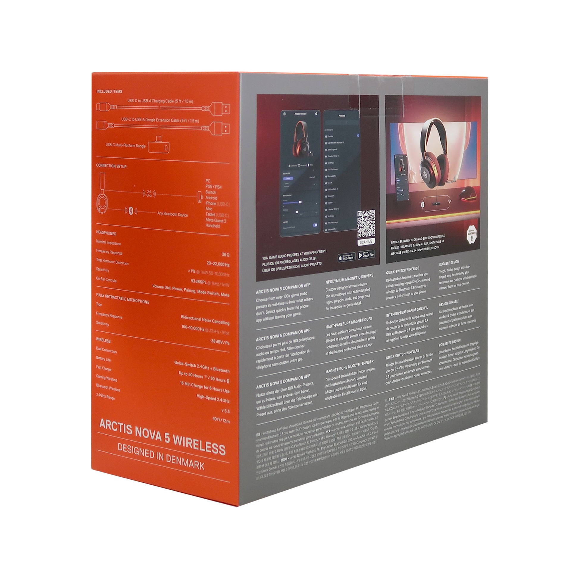 Unlock 100+ game audio presets with Arctis Nova 5 and the Companion App. Switch detailed EQ profiles for games like Fortnite, Apex Legends, Minecraft and more without leaving the game. With 60-hour battery life, and 2.4GHz/Bluetooth wireless, play longer on PC, PS, Switch and mobile with a USB-C wireless dongle.
