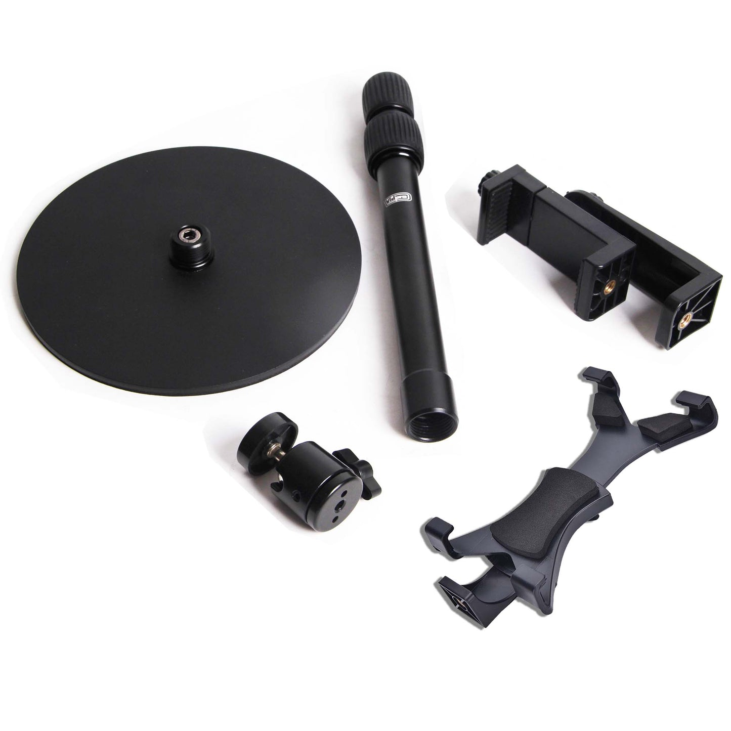 The Vidpro ST-18 offers top-notch durability and performance. Engineered of solid anodized aluminum with a steel weighted base, it provides a sturdy platform ideal for multi-purpose desktop use. Easy rubberized twist-locks provide fast height adjustments. Unit includes a mini rotating ball Head with ¼ inch screw for flexible mounting options. It also included is a smart phone clamp with vertical and horizontal position adjustment feature, and a steel ball head that can rotate 360° horizontally and 140° vertically for your better use.