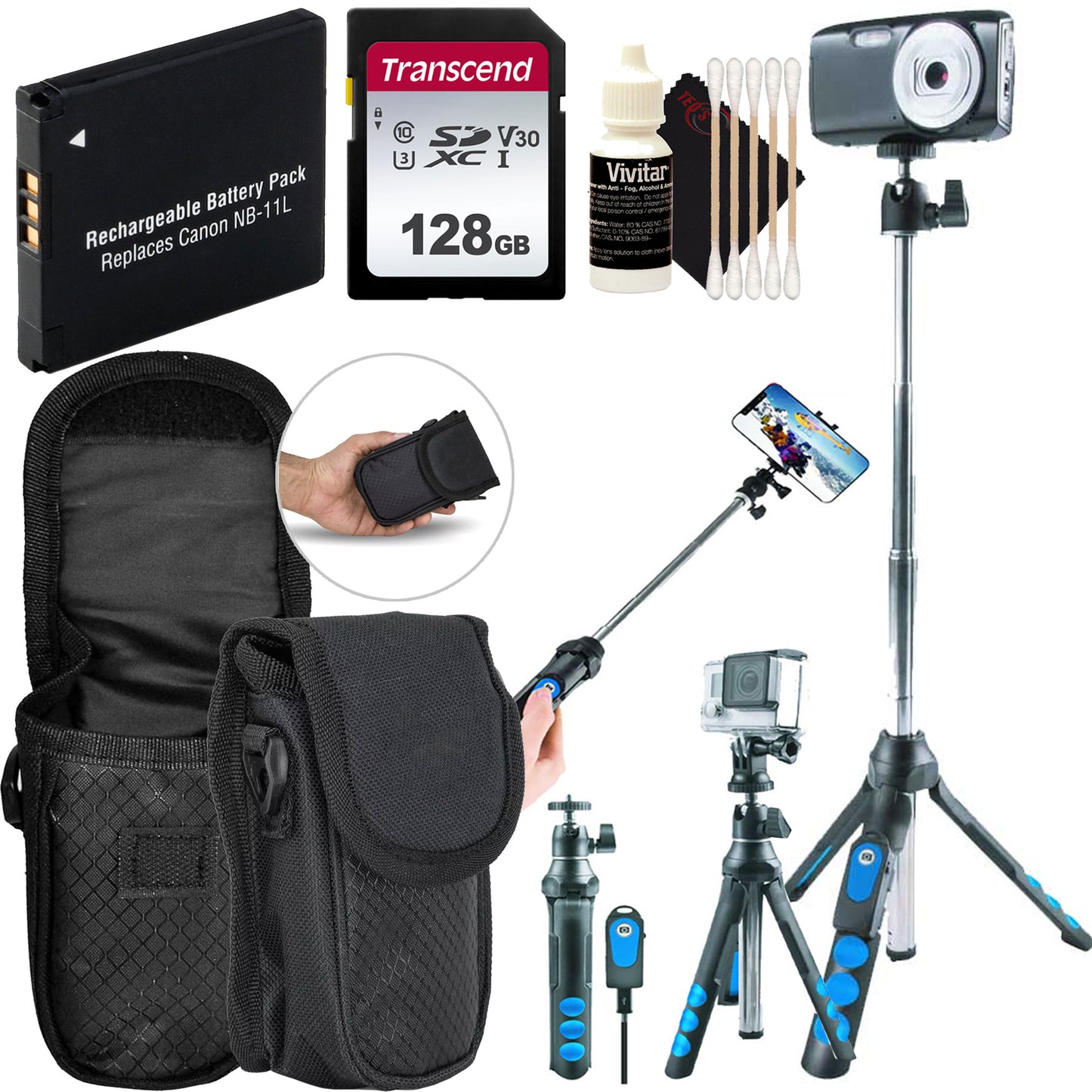 This comprehensive kit includes everything you need to elevate your photography and streaming experience. The bundle features a high-capacity Replacement Battery for Canon NB-11H, ensuring your camera is always ready for action. The Vivitar 7-in-1 Streaming Essentials Selfie Tripod Selfie Stick offers versatile mounting options for smartphones, cameras, and GoPros, making it perfect for selfies, vlogging, and live streaming. Store your memories with the reliable Transcend 128GB SDXC/SDHC Memory Card, providing ample space for high-resolution photos and videos. Protect your camera with the Neoprene Compact Protective Carrying Case, designed for durability and convenience. Maintain your gear in top condition with the included Cleaning Kit, ensuring crystal-clear shots every time. Whether you're an avid traveler, a budding photographer, or a streaming enthusiast, this all-in-one accessory bundle is designed to meet all your needs and more