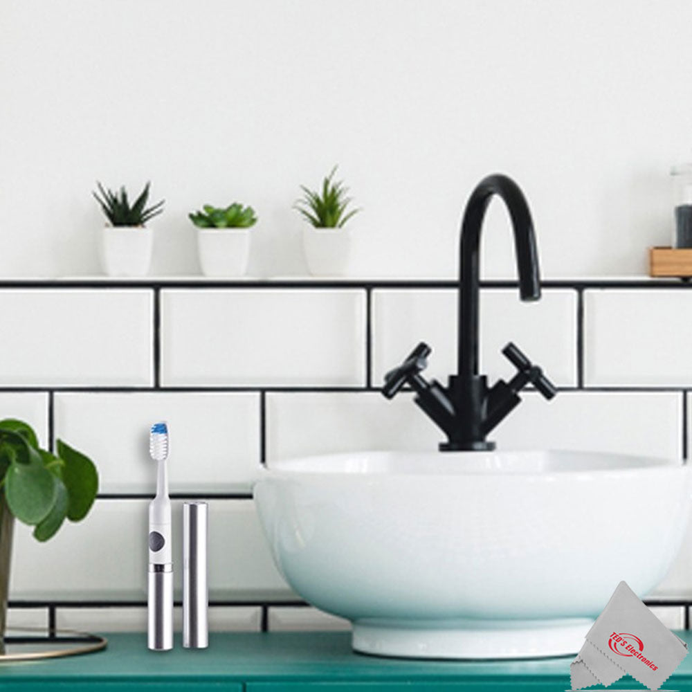 The slim design fits easily in a handbag or luggage. Vented cap allows the brush to dry between uses while keeping it protected from germs and bacteria. Comes with a battery and six replaceable brush heads. Includes 1 AA battery.