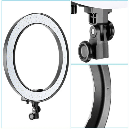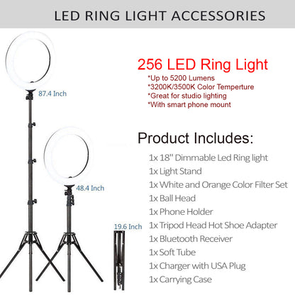 This ring light kit comes with all the accessories you need to get started as a makeup artist, portrait shooter or online personality. It produces a maximum output of 5200 lumens, using only 60 watts of energy. Composed of 256 individual surface-mount LEDs, this unit produces a daylight-balanced color temperature of 5500K using the standard diffuser, and 3200K/3500K with the warming filter. The light output can be easily adjusted 10-100% with the stepless dimmer on the back of the unit.