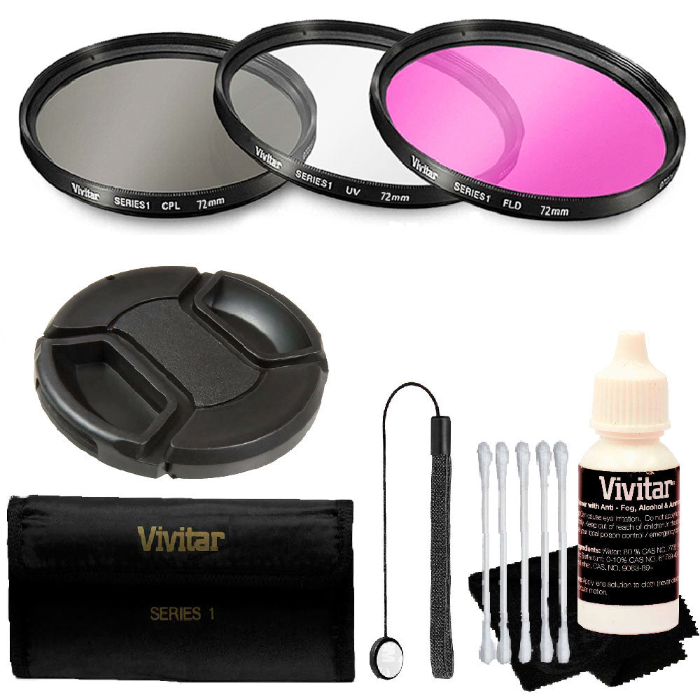 3 piece filter kit from Vivitar includes UV, CPL, and FLD filters. Filters are constructed from high quality optical glass and nested in an Aluminum Alloy frame for maximum clarity and vivid picture. UV, or Ultraviolet Filter is a general use, clear filter. It absorbs ultraviolet light, eliminates haze, and reduces bluish casts of daylight. UV filters serves as permanent lens protection agains dirt, dust and stain. CPL, or Circular Polarized Filter, filters out Polarized light reducing reflection from non-metallic surfaces, increasing the contrast, enhancing color and eliminating haze. FLD, or Fluorescent filter for Daylight film, corrects color contrast, or white balance, reducing greenish casts while shooting daylight film under fluorescent light. Vivitar's pouch for filters is constructed of strong, durable material and is well padded for assuring high quality, scratch free storing. Lens cleaning kit from Vivitar includes 3 types of cleaning tools that can keep optics dust, dirt and smudge free. A microfiber cleaning cloth provides the ability to quickly wipe clean front lens element, filters or viewing screen of camera or smartphone. For small areas where microfiber cloth can't reach, 5 swabs are supplied with each having two absorbent ends on a small plastic handle. A bottle cleaning fluid is also provided when stubborn spots are encountered. Fluid may be applied to microfiber cloth or swabs for advances cleaning.Side pinch lens cap snaps unto lens to protect from scratches, moisture, dirt and fingerprints . Lens cap keeper prevents the loss of lens cap. An adhesive-backed disc secures the lens cap to an elastic leash which wraps around the lens barrel. When lens cap is removed from lens while shooting it hangs out of the way yet secure and within reach for easy retrieval.