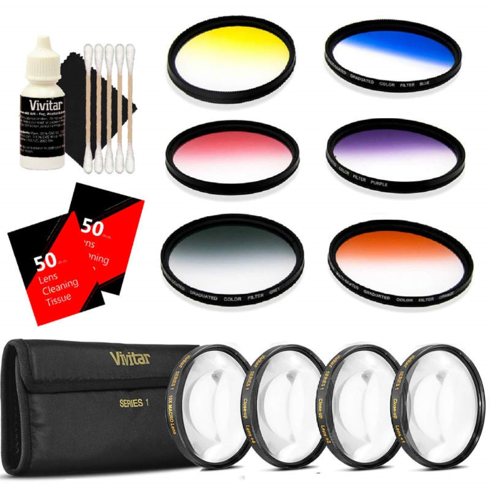Vivitar multi coated essential graduated 6 piece color filter kit is constructed of high quality glass and nested into an aluminum alloy rotating frame to allow desired placement of color provide a gradual color transition for a smooth blending effect. Graduated filter give your landscape and skin texture a more colorful touch and is perfect for changing the mood of a picture. Side pinch lens cap snaps unto lens to protect from scratches, moisture, dirt and fingerprints . With Vivitar 67mm Close Up Diopter Filters Set + 100 Lens Tissue Sheet + 3pc Cleaning Kit