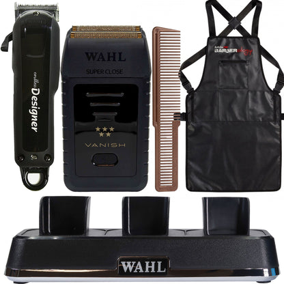 WAHL PROFESSIONAL 8591 CORD/CORDLESS DESIGNER CLIPPER + WAHL 5 STAR VANISH SHAVER 8173-700 + WAHL PROFESSIONAL POWER STATION MULTI CHARGE + WAHL LARGE STYLING COMB + BABYLISS PRO INDUSTRIAL BARBER APRON