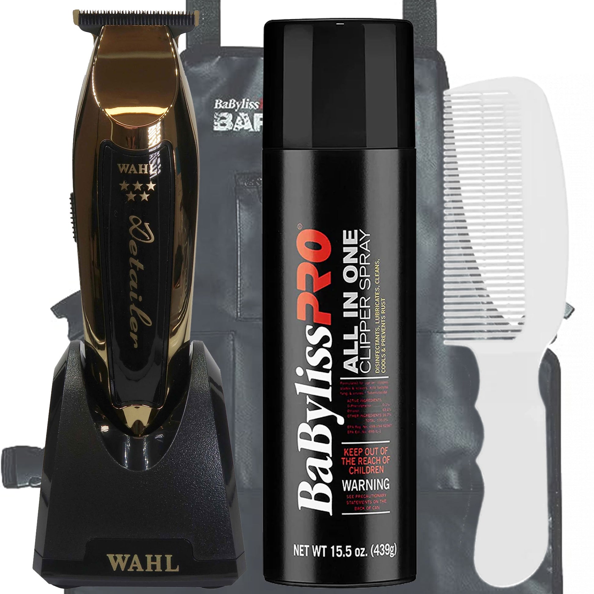 WAHL 5 STAR GOLD CORDLESS DETAILER LI TRIMMER #8171-700 + BABYLISS PRO FXDS15 AALL IN ONE CLIPPER SPRAY + BABYLISS PRO BARBEROLOGY INDUSTRIAL BARBER APRON + WAHL FLAT TOP COMB 3329-100