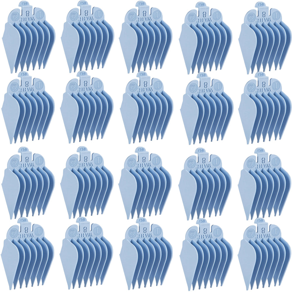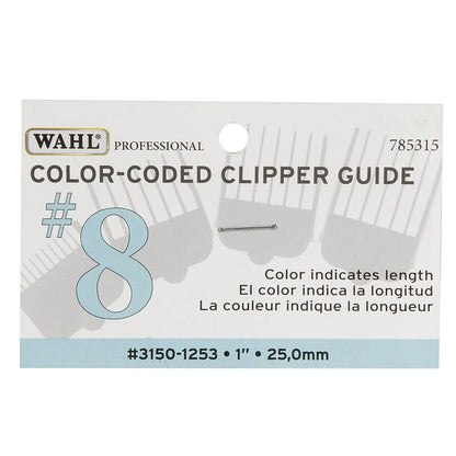 The Color Coded Comb #8 Attachment (#3150 1253) is Light Blue in Color and provides a 1" (25mm) length. Fits all Wahl Full-size clippers blades except for Competition Series and 5 in 1 Magic blade; Made in the U.S.A