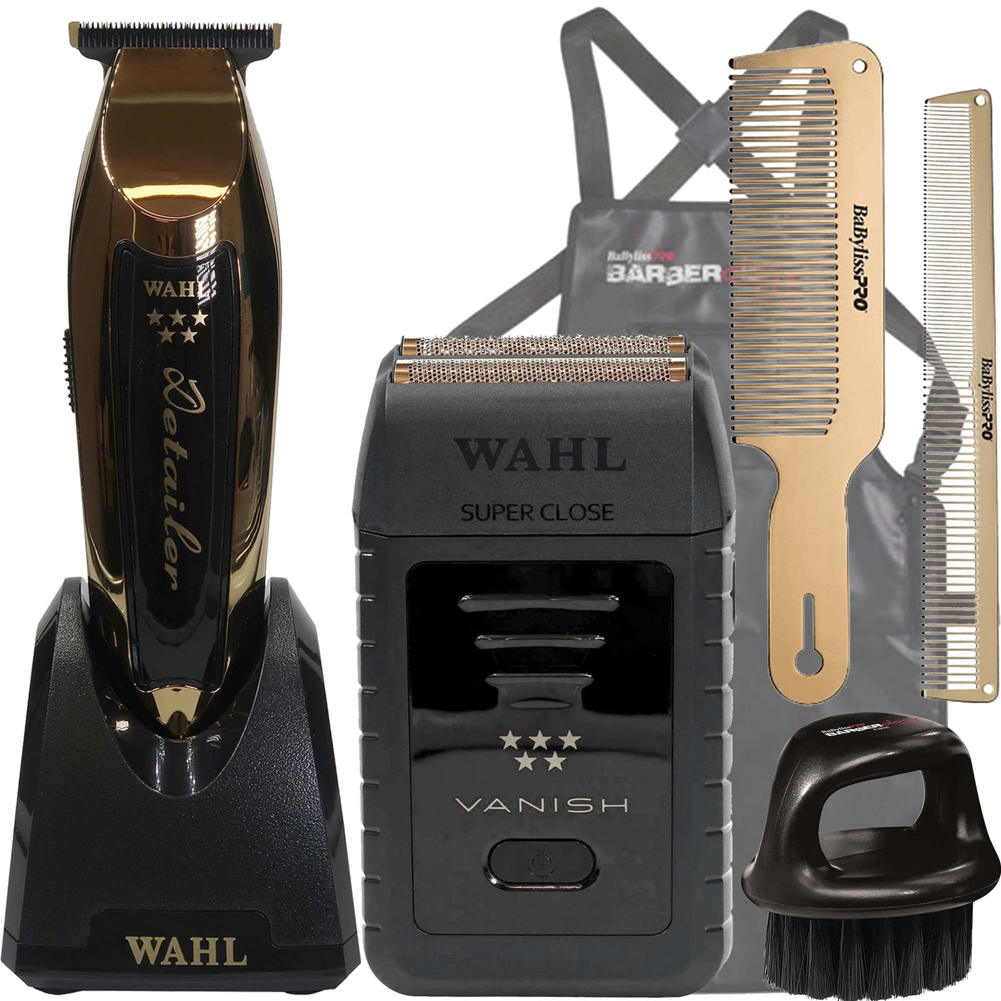 Wahl 5 Star Gold Detailer Cordless Li Trimmer + Wahl 5 Star Vanish Shaver 8173-700 + Babyliss Pro Barberology Barber Apron + BaByliss Pro Barberology GoldFX Metal Comb Set + BaBylissPro Barberology Fade Soft Knuckle Neck Brush Black