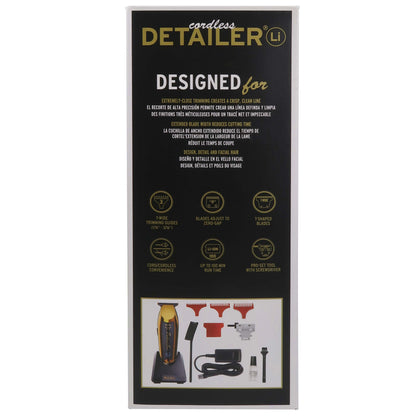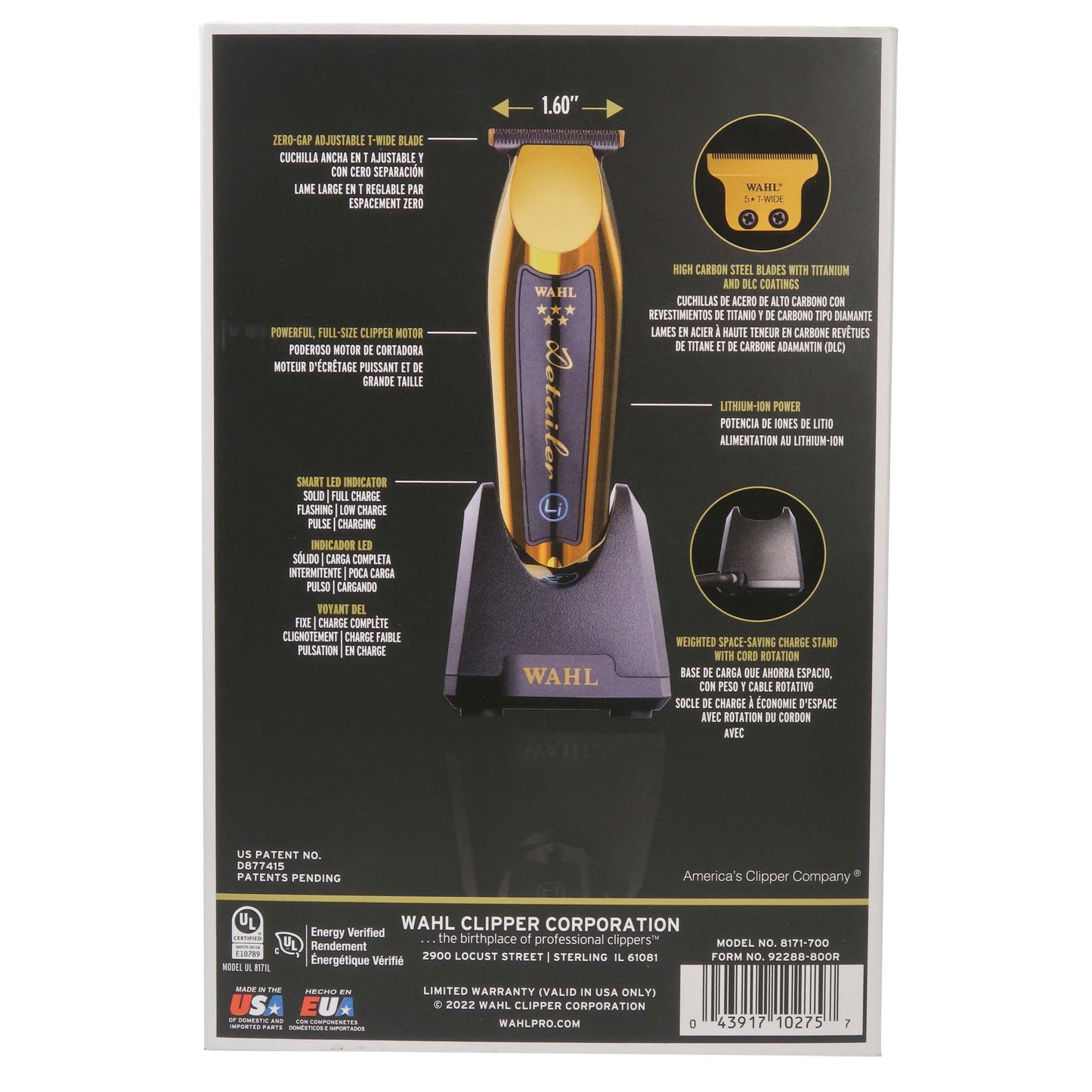 The Wahl 5 Star Trimmer has a T-wide blade and has titanium and DLC coatings so that blades stay cooler, are corrosion resistant, and are extremely strong, delivering consistently high performance. The cordless Detailer Li Gold has an adjustable T-wide blade (#2215-700) for extremely close trimming. It operates for 100+ minutes on a full charge and comes with a weighted, space-saving charge stand. It features a lithium-ion battery with smart LED charging. This American-made professional hair trimmer uses a powerful, full-sized clipper motor to cut smoothly through all hair types. Blades can be zero-gapped using the Pro-Set tool and is ideal for lining, trimming, and facial hair detailing and design.