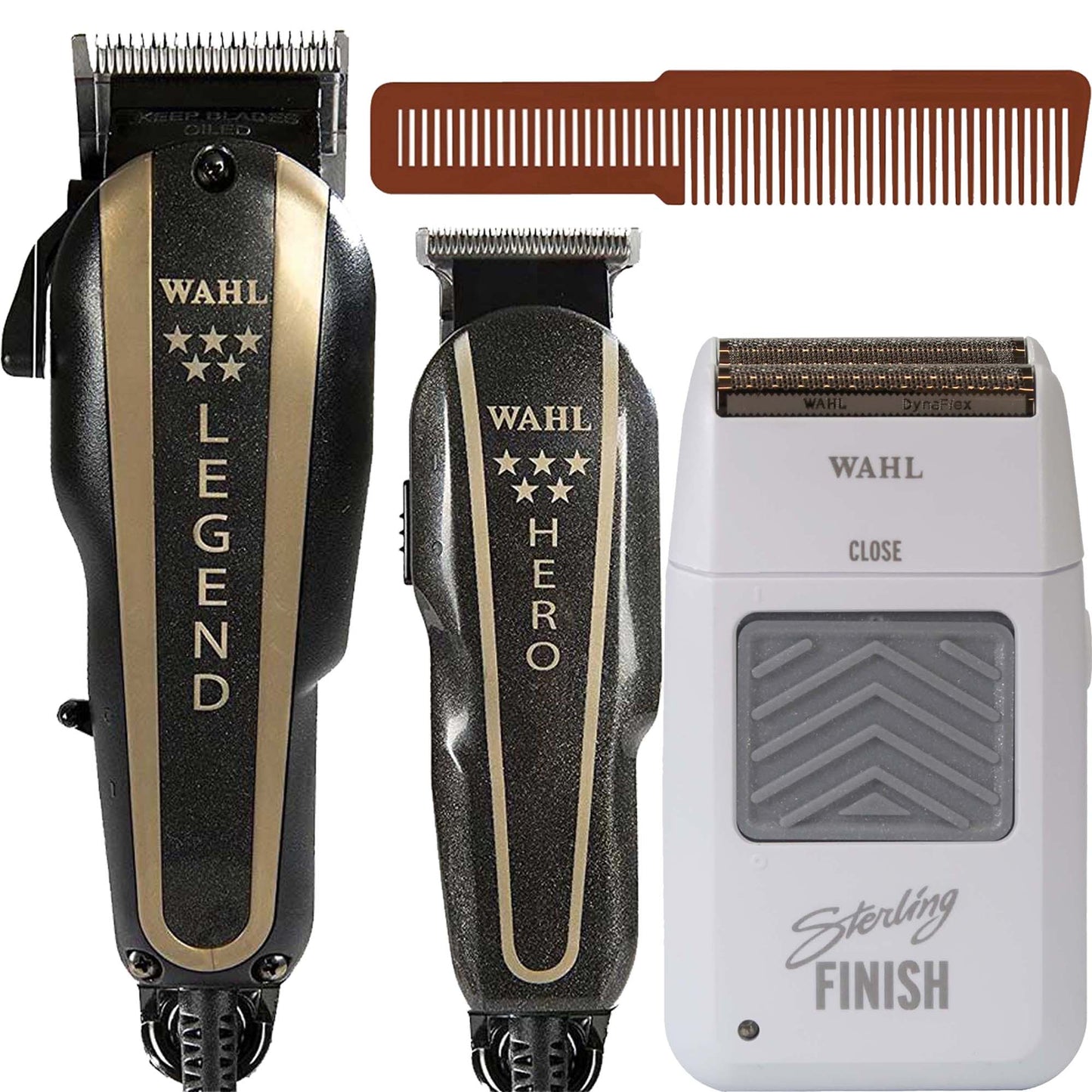 Wahl Professional Trimmer HERO & Hair Clipper LEGEND 5 Star Barber Combo 8180 with Wahl Professional Sterling Finish Limited Edition Shaver White 8174 and Wahl Styling Comb Brown