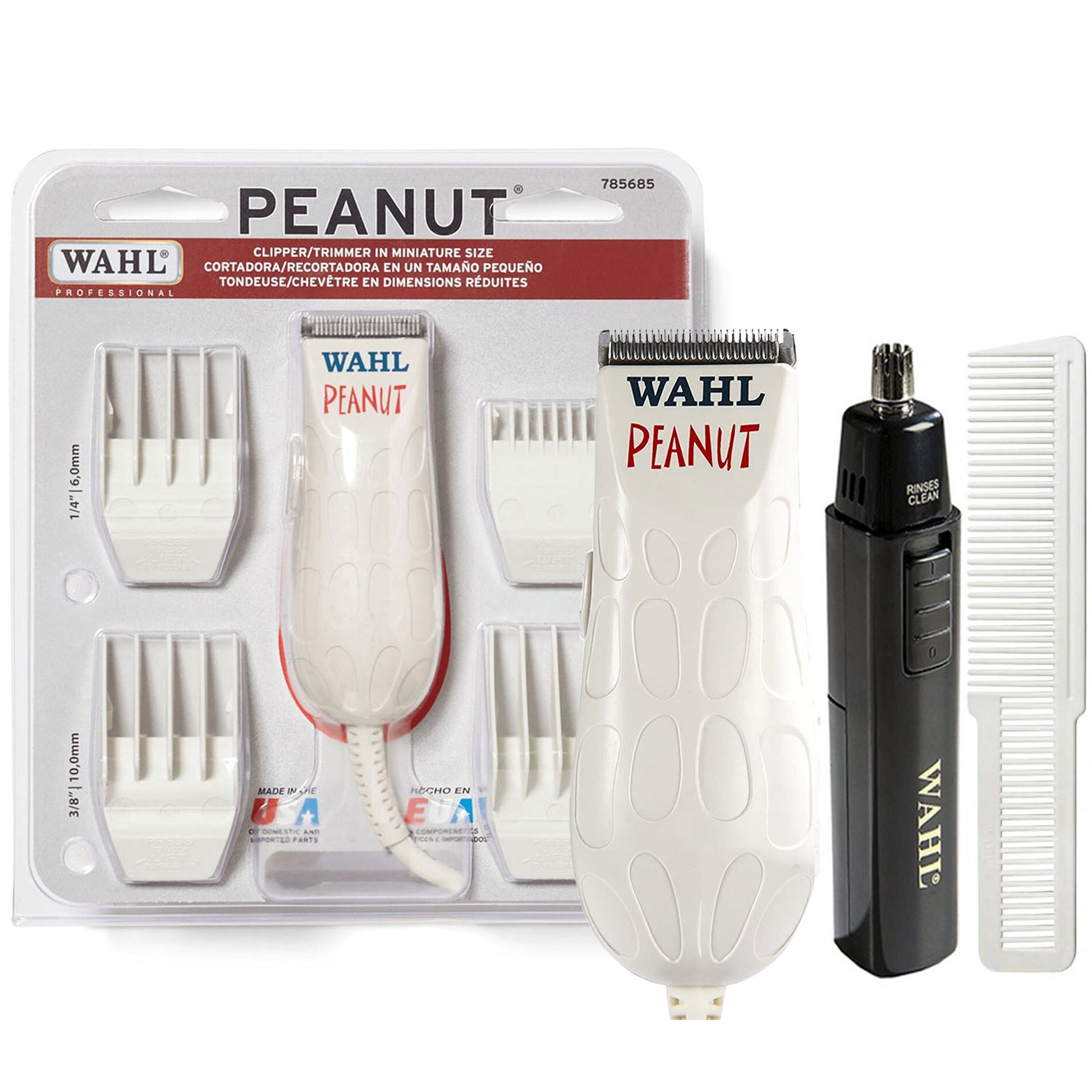 Wahl Peanut 8655 Trimmer / Clipper White This Wahl hair trimmer is compact and rechargeable. It features adjustable speed settings, a strong motor, and interchangeable heads to make hair maintenance a breeze. The trimmer is lightweight and made of sturdy white plastic. The trimmer can be used for both trimming and clipping and is designed for both men and women. The blade is detachable for easy cleaning, which also makes it suitable for travel.