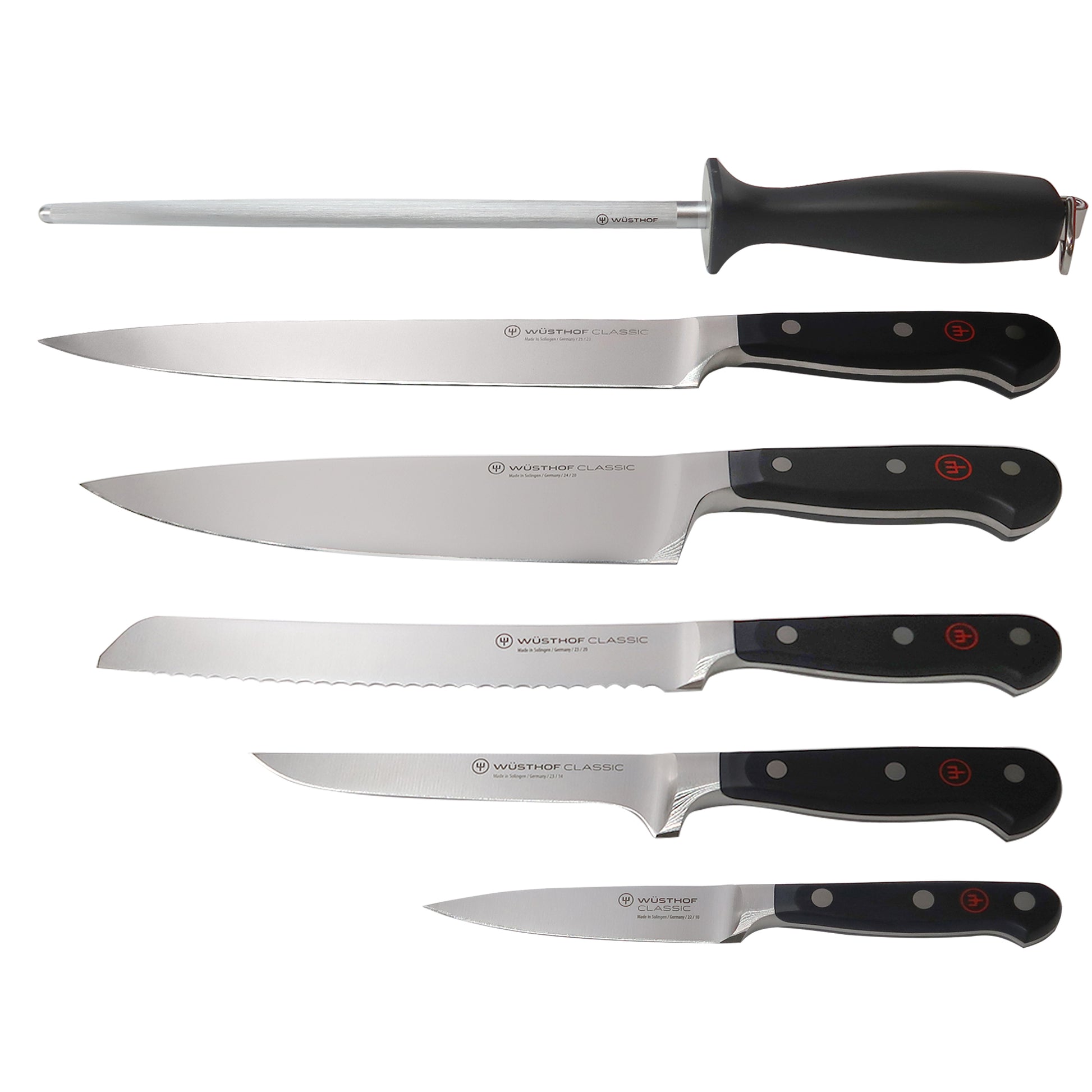 6 Piece Chef's Knife Set with full tang triple riveted synthetic polypropylene handles that resist fading, discoloration, heat and impact. The WÜSTHOF Classic Series has been our best-selling series.