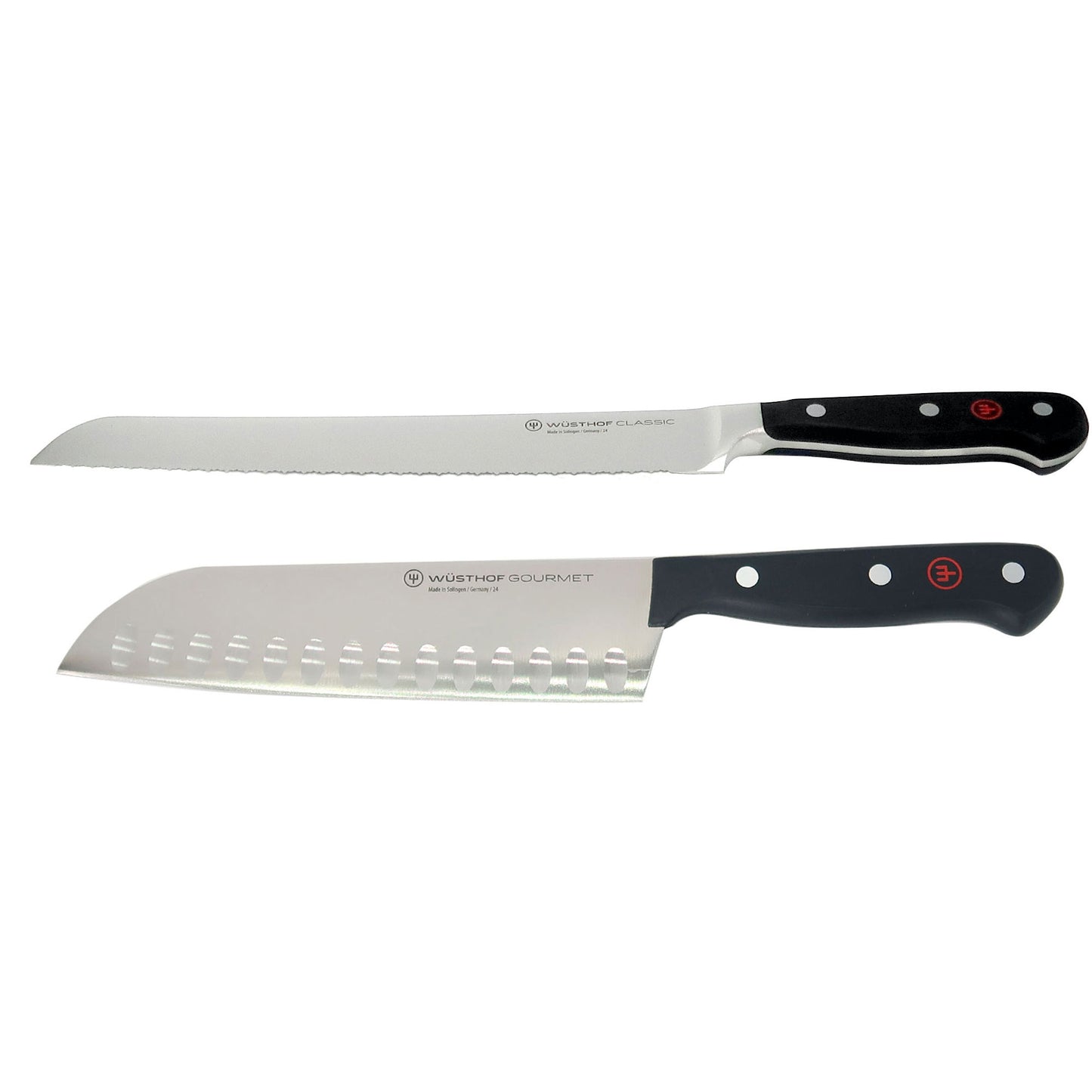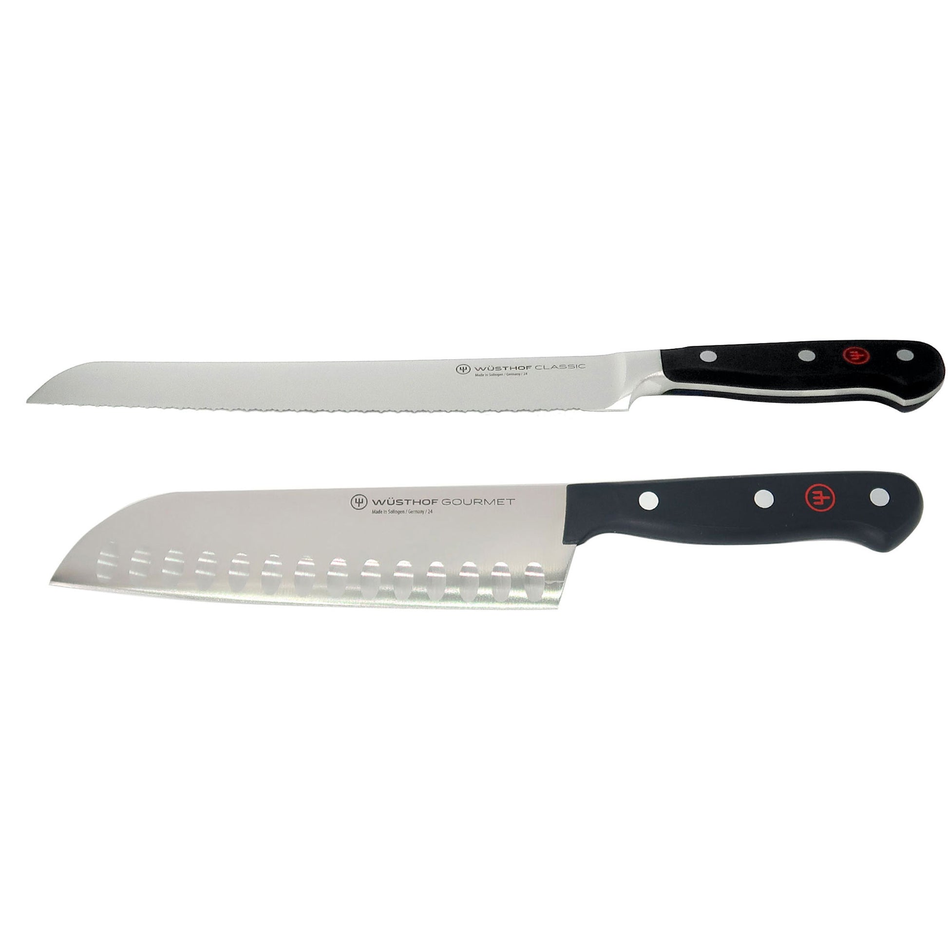 WUSTHOF CLASSIC 9" BREAD KNIFE, SILVER + WUSTHOF GOURMET 7" HOLLOW EDGE SANTOKU KNIFE, BLACK