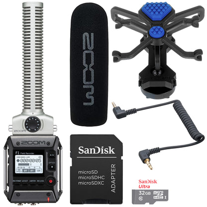 ZOOM F1-SP 2-INPUT / 2-TRACK PORTABLE FIELD RECORDER WITH SHOTGUN MICROPHONE + SANDISK 32GB ULTRA UHS-I MICROSDHC MEMORY CARD WITH SD ADAPTER