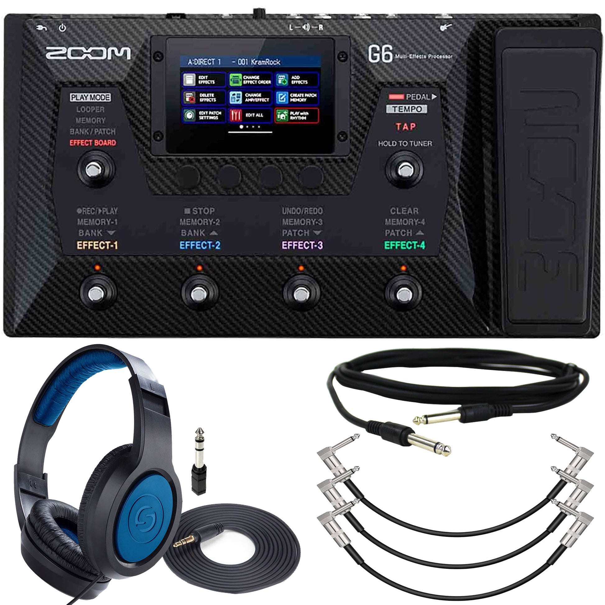 ZOOM MULTI-EFFECTS PROCESSOR PEDAL FOR GUITARISTS + SAMSON SR350 OVER-EAR STEREO HEADPHONES (SPECIAL EDITION BLUE) + PIG HOG 6FT 1/4" TRS - 1/4" TRS CABLE + PIG HOG PHLIL6BK LIL' PIGS RIGHT ANGLE TO RIGHT ANGLE 1/4" BLACK WOVEN INSTRUMENT PATCH CABLES, 6" (3 PACK)