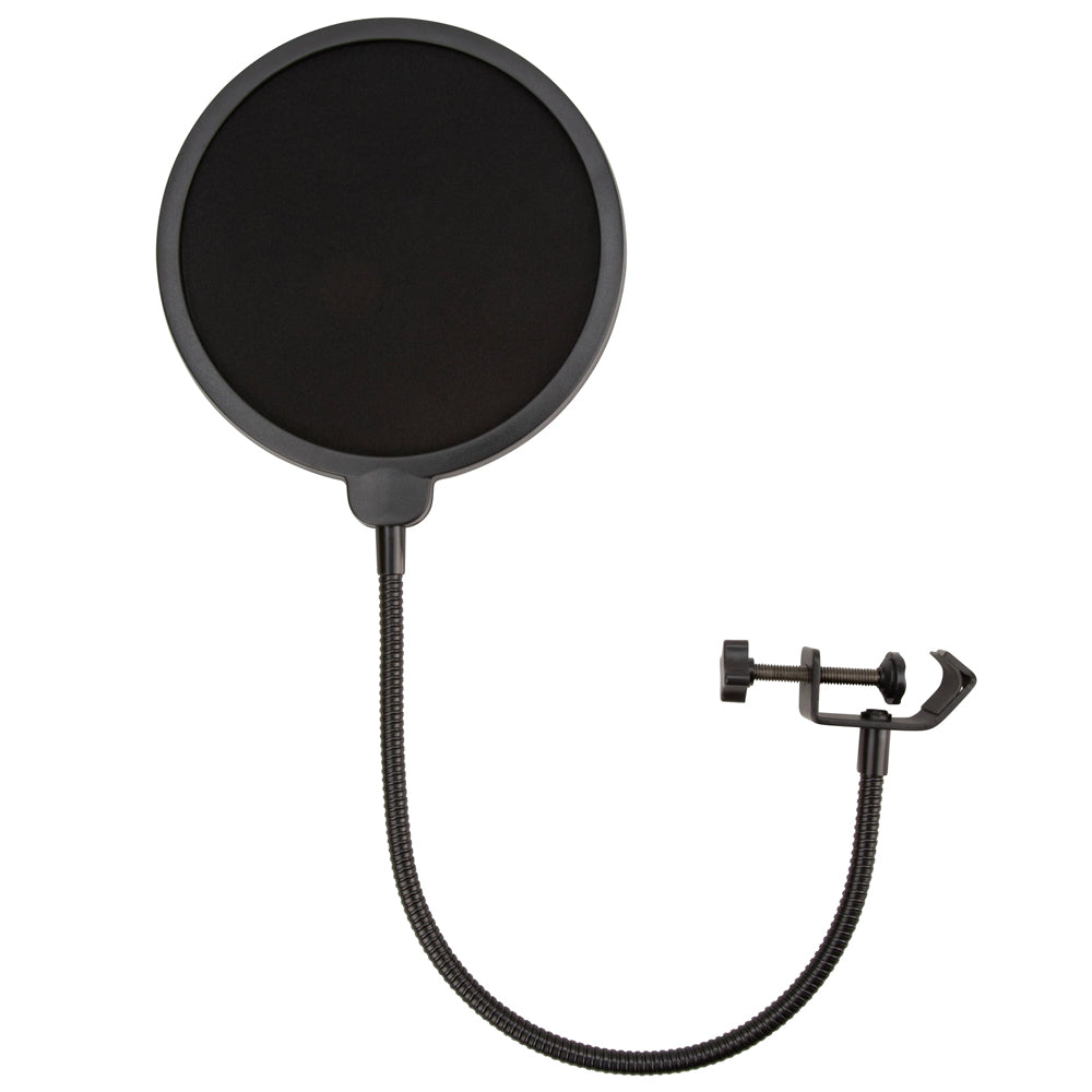 Microphone Pop Filter, PHMPOP The microphone pop filter makes recording a breeze! The dual-layer pop filter blocks breathy blasts and arrests air movement while allowing sound to slip through easily. This allows you to achieve amazing, clean recordings by preventing plosives and hissing. The adjustable clamp can be attached to a wide variety of stands, and the durable metal gooseneck adjusts to virtually any angle and distance.