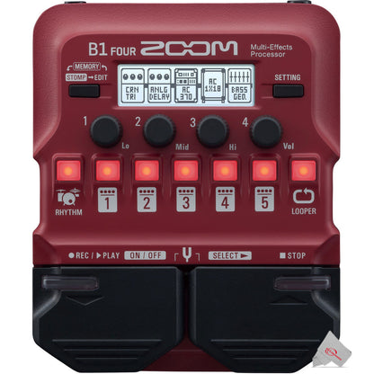 The Zoom B1 Four is a multi-effects processor designed for use with electric basses. Offered in an easy to use stompbox format, the B1 Four sports a wide selection of effects, amp emulations, and other features, such as an onboard 30-second looper and a chromatic tuner. With 68 built-in rhythm patterns, you can add drum loops to the mix, which can be quite helpful during looping.
