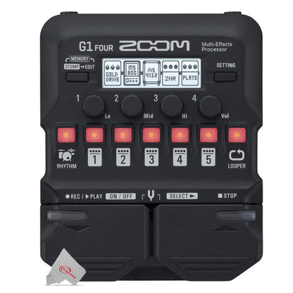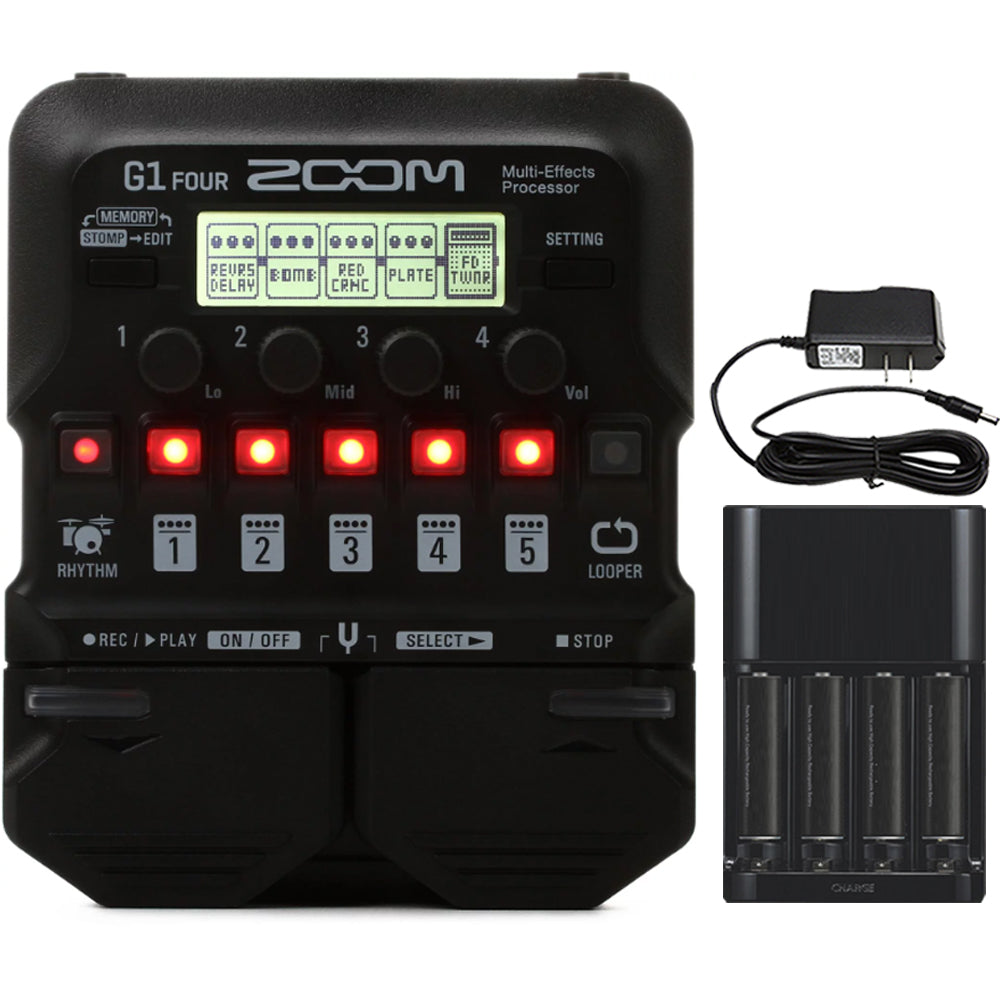 The G1 Four provides one 1/4" instrument input, one 3.5mm input for mobile devices and media players, and a combined amp/headphone output. The unit runs on four AA batteries, giving you up to 18 hours of run time. You can also power the unit with a dedicated ZOOM AD-16 AC adapter or over USB.