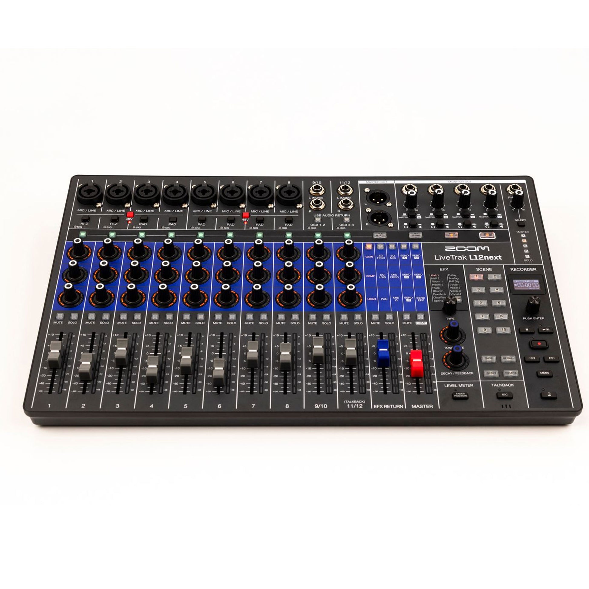 LiveTrak L12next Digital Mixer / Recorder The L12next combines the power of a digital mixer with analog-style operation. Three knobs per channel deliver High/Mid/Low EQ, and with a simple switch, you can adjust gain, pan, and sends, offering hands-on mixing like a classic analog console.