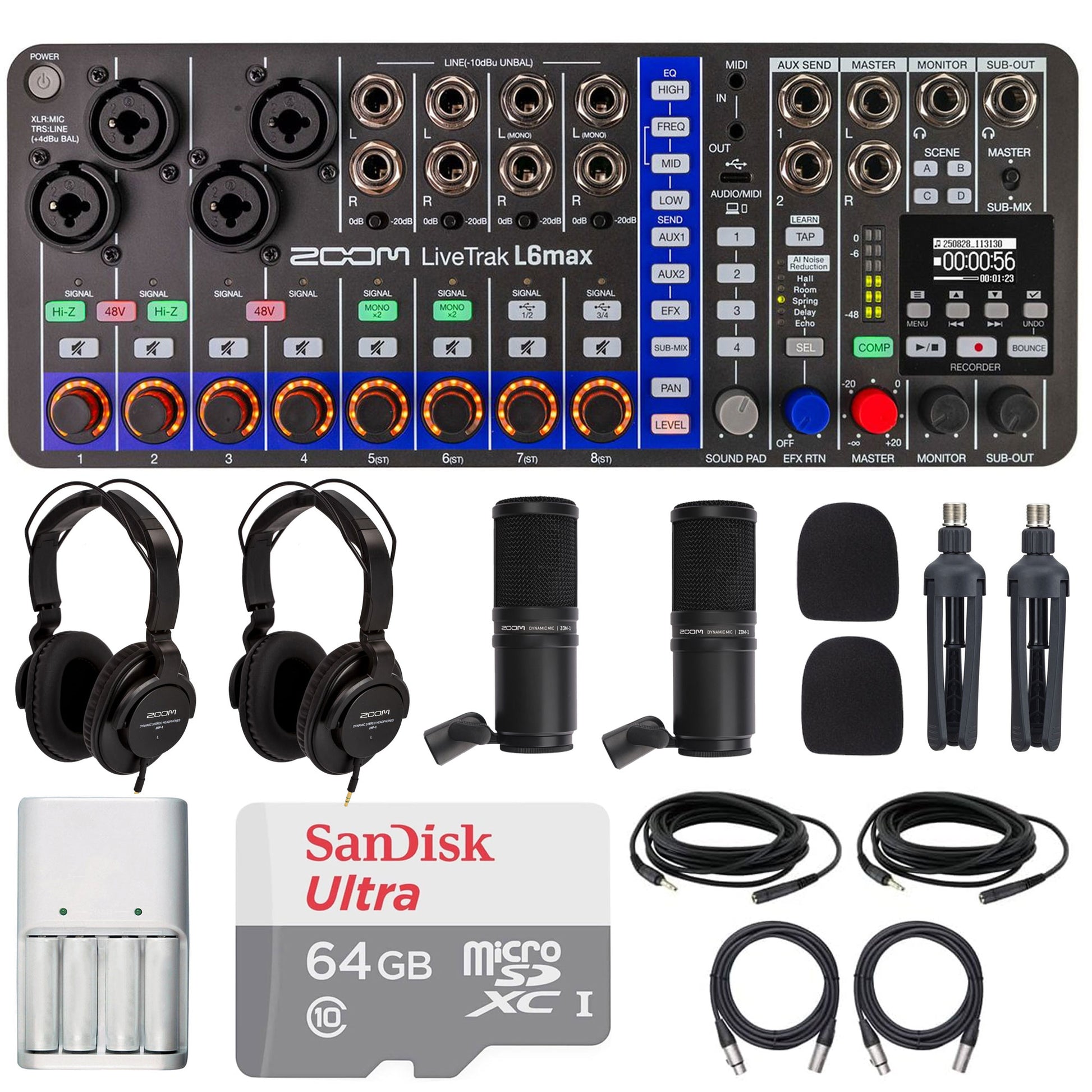Zoom LiveTrak L6max Portable 12-Channel Mixer & Recorder with 2x ZDM-1 Podcast Mic Pack + Pro Audio Bundle LiveTrak L6max - 12-Channel Mixer & Recorder for Music, Streaming, and Podcasts The LiveTrak L6max is packed with all the features you’d expect from a full-size mixer, plus a multi-track recorder. It’s compact, battery powered, and ready to be the centerpiece of your live show, rehearsal or podcast.