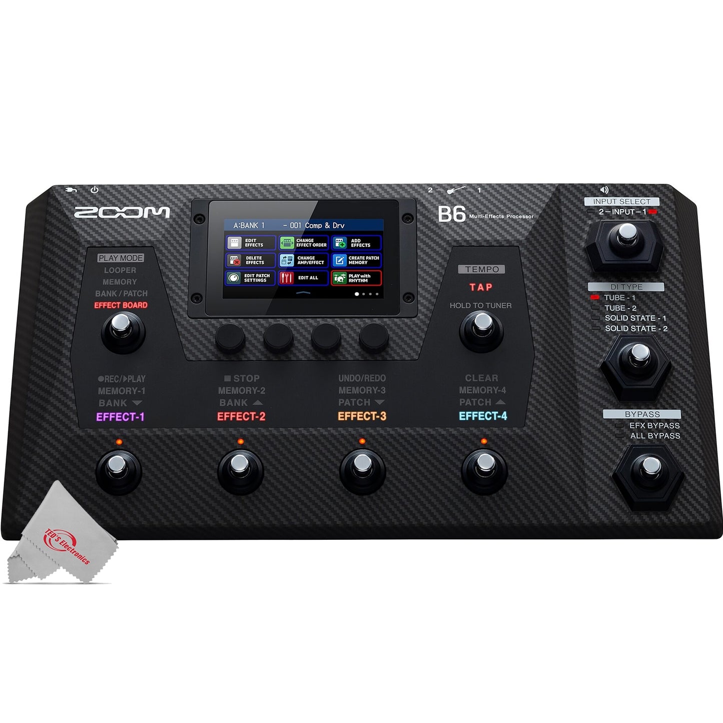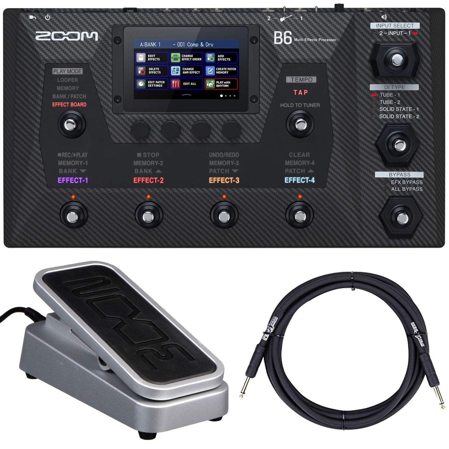 The Zoom B6 Multi-Effects Processor features four DI models and advanced multi-effects, giving you the freedom and versatility to explore entirely new sounds with your bass. It includes an analog circuit to improve the low-end frequencies, and an 88.2 kHz effects processor to cover your high ends. Separate inputs allow you to A/B switch from electric bass to synth or acoustic bass, and back again. The B6 Multi-Effects Processor also carries a collection of classic Zoom effects, along with 10 new ones to explore. It has four different Play Modes that adjust the touchscreen and footswitch layout to give you quick access to the controls you need. Create loops and recordings up to two hours long, saved directly to an SD/SDXC card for instant access and recall, or select from the B6’s 68 rhythm patterns in a range of styles, tempos and time signatures.