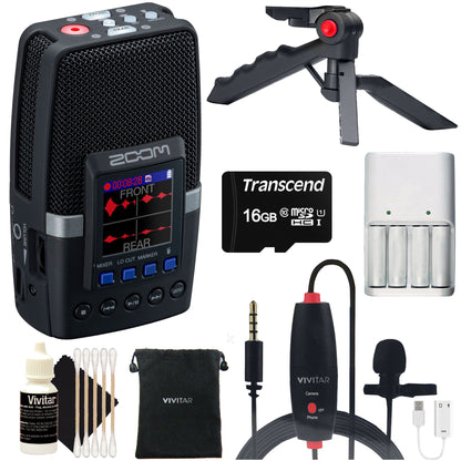 ZOOM H2ESSENTIAL MULTI-MIC 32-BIT FLOAT HANDY RECORDER + VIVITAR MINI LAVALIER STREAMING MICROPHONE OMNI DIRECTIONAL WITH USB ADAPTER + TRANSCEND 16GB MICROSD MEMORY CARD WITH SD ADAPTER + XTREME POWER SERIES 4AA/AAA BATTERY & CHARGER + PISTOL GRIP TABLETOP TRIPOD + VIVITAR 3PC CLEANING KIT